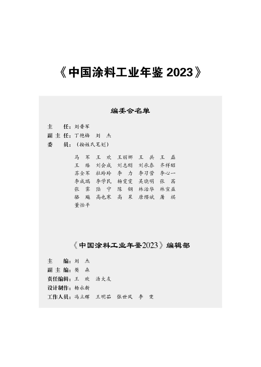 《中國涂料工業年鑒2023》的編撰完成得到了業內專家和相關企業的大力支持。在此對所有關心和幫助年鑒順利出版的各界人士謹表謝意!編撰中難免有不足之處,請不吝指正!