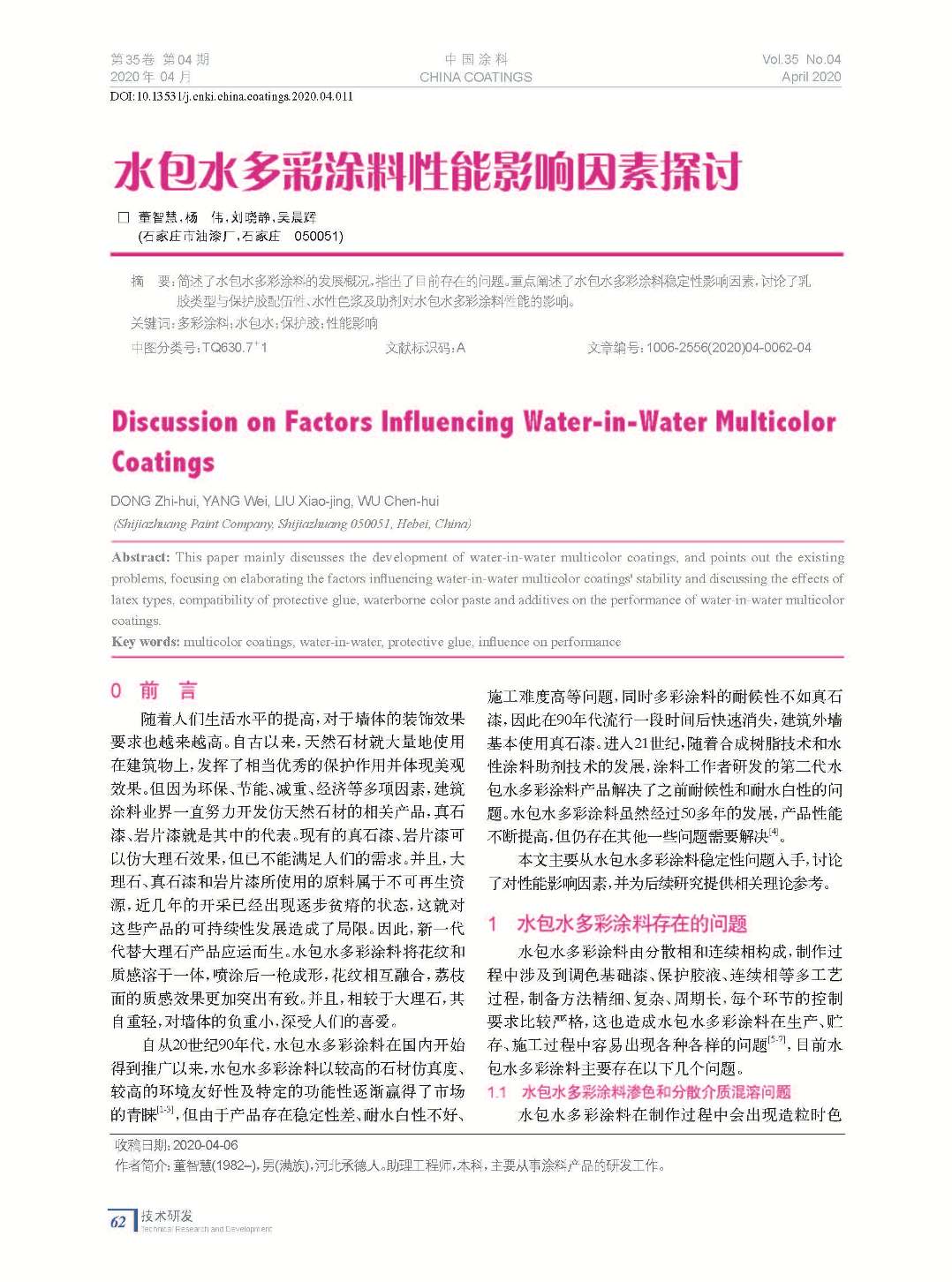 簡述了水包水多彩涂料的發展概況,指出了目前存在的問題。重點闡述了水包水多彩涂料穩定性影響因素,討論了乳膠類型與保護膠配伍性、水性色漿及助劑對水包水多彩涂料性能的影響。