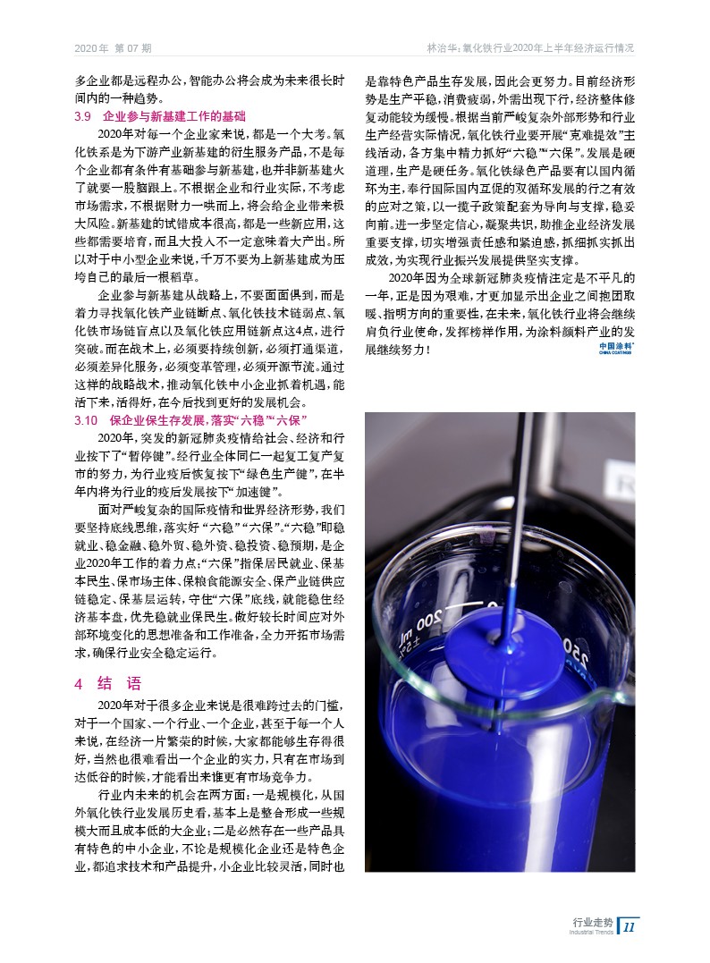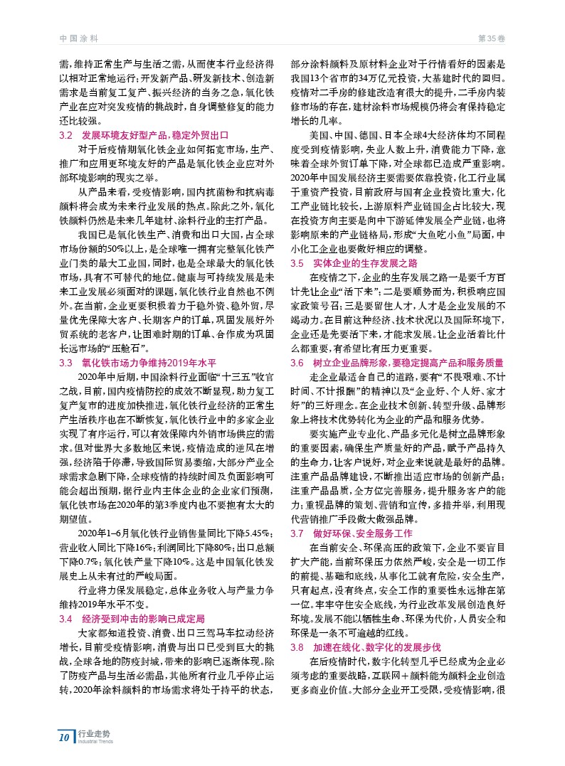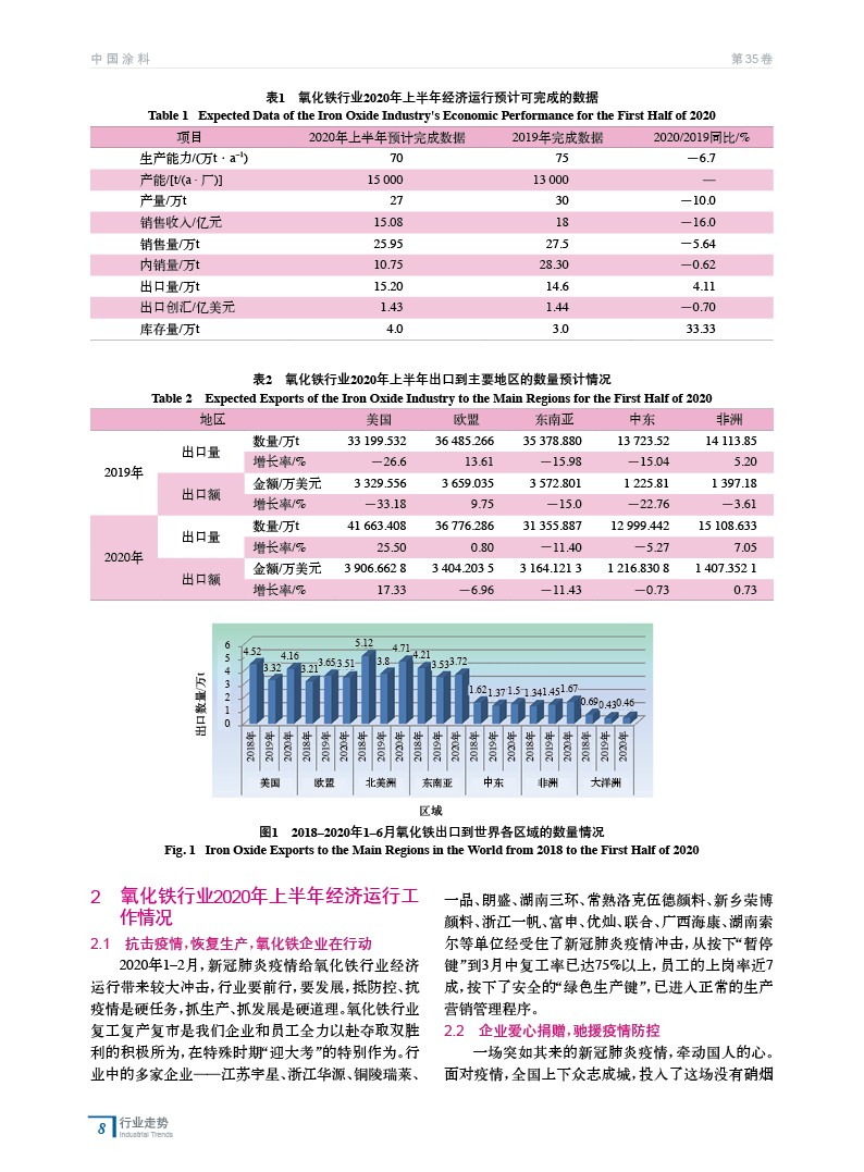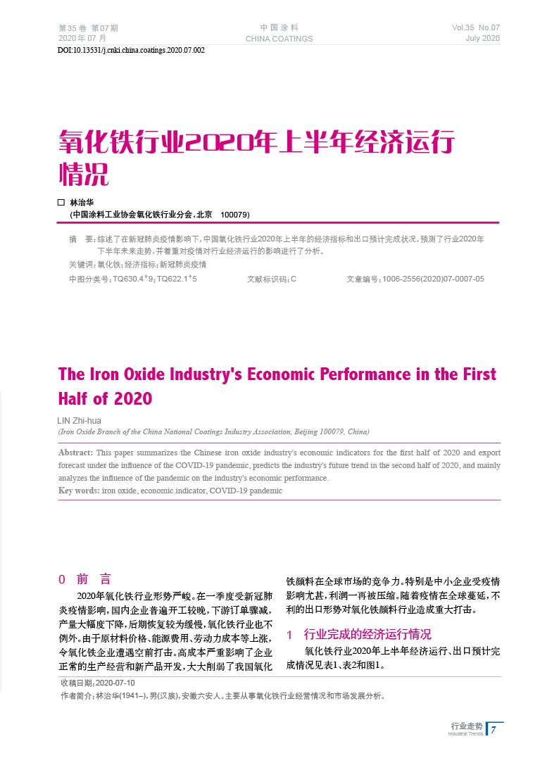 綜述了在新冠肺炎疫情影響下,中國氧化鐵行業2020年上半年的經濟指標和出口預計完成狀況,預測了行業2020年下半年未來走勢,并著重對疫情對行業經濟運行的影響進行了分析。