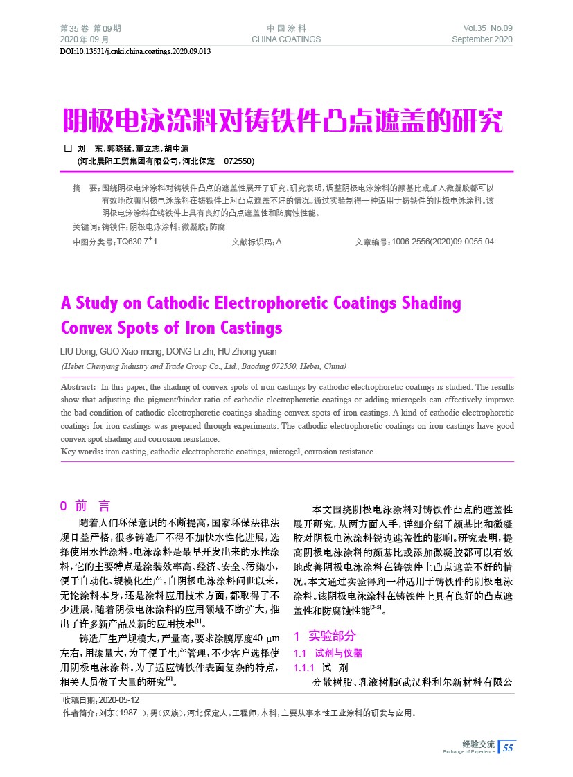 圍繞陰極電泳涂料對鑄鐵件凸點的遮蓋性展開了研究。研究表明,調整陰極電泳涂料的顏基比或加入微凝膠都可以有效地改善陰極電泳涂料在鑄鐵件上對凸點遮蓋不好的情況。通過實驗制得一種適用于鑄鐵件的陰極電泳涂料。該陰極電泳涂料在鑄鐵件上具有良好的凸點遮蓋性和防腐蝕性能。