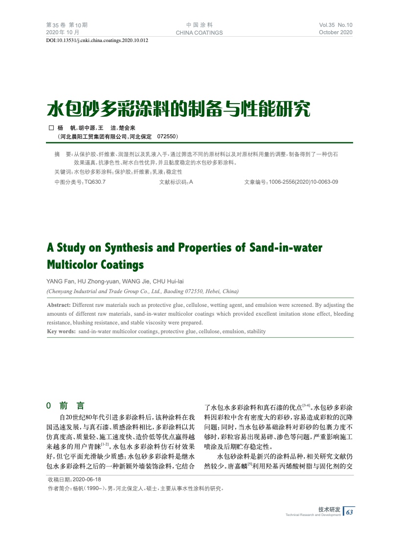 本文系作者@楊 帆,胡中源,王 潔,楚會來 授權中國涂料網發表,并經中國涂料網編輯,未經允許不得轉載,如需轉載請聯系chinacoatingnet@vip.163.com