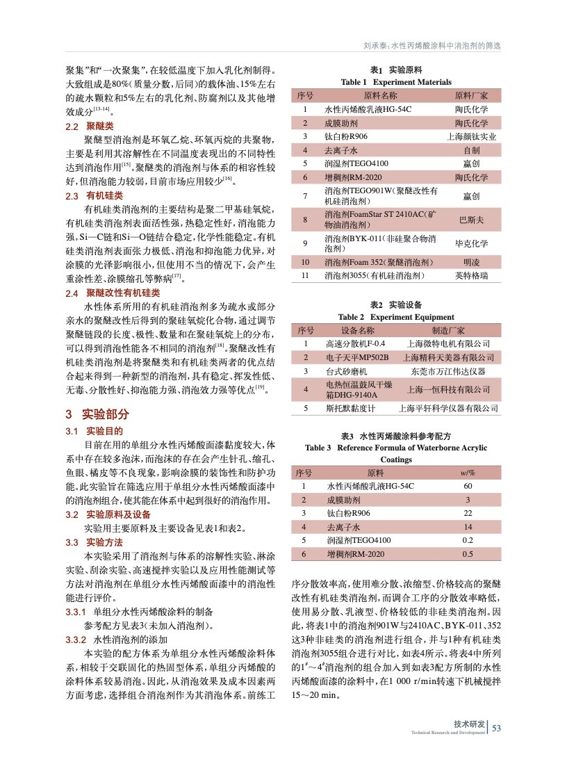 對水性涂料中氣泡的產生及穩定進行了闡述,同時介紹了消泡劑的種類及特點。通過溶解性實驗、高速攪拌實驗以及應用實驗,評價了4組不同種類的消泡劑組合在單組分水性丙烯酸面漆中的消泡性能,并討論了影響水性涂料泡沫的因素。