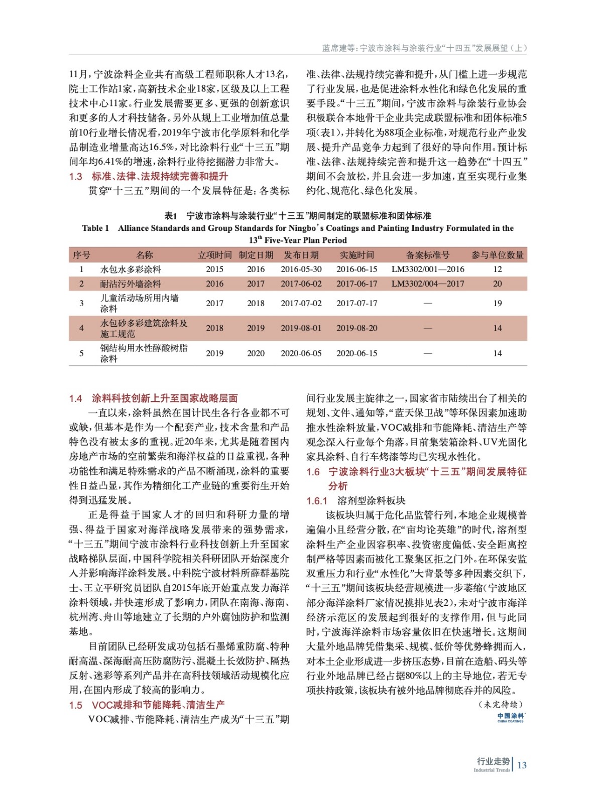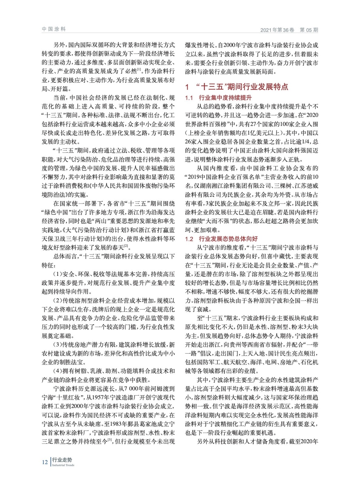 系統總結回顧了“十三五”期間涂料與涂裝行業發展特點,詳細分析了寧波涂料產業“十三五”期間“三大板塊”的發展特征,并對“十四五”期間的發展情況進行了預測和展望。