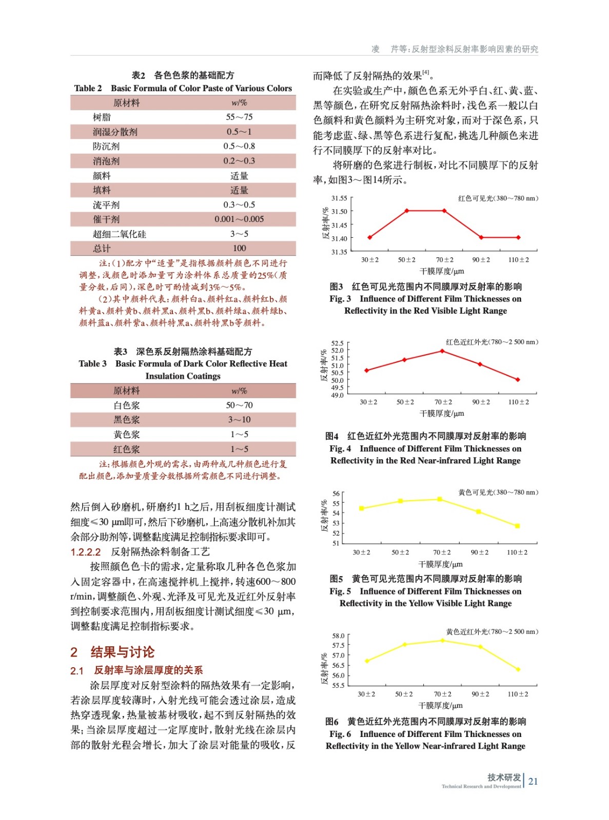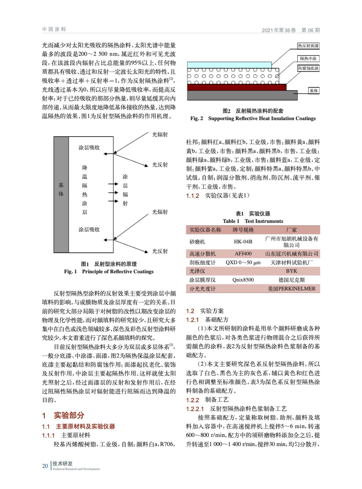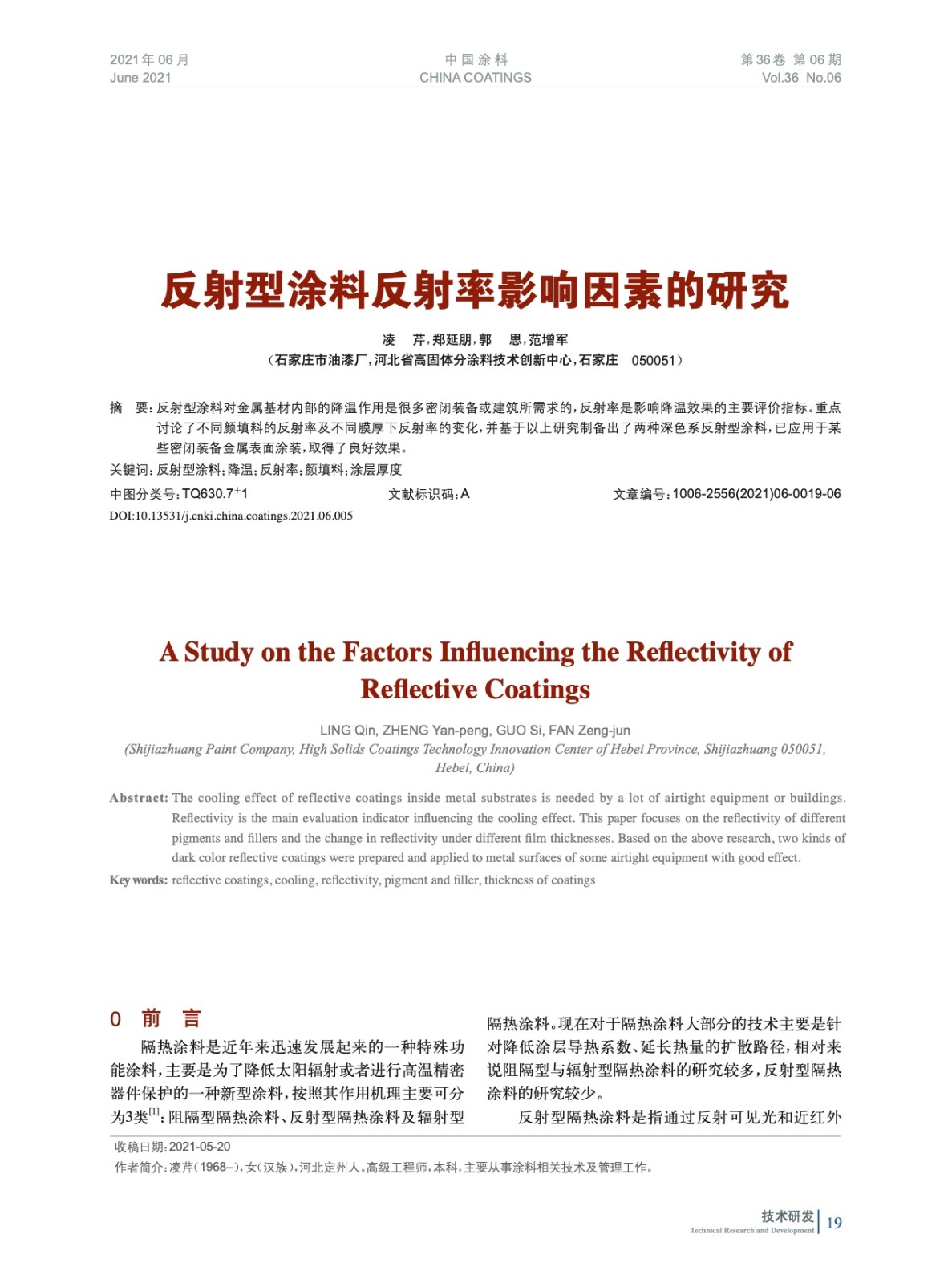 反射型涂料對金屬基材內部的降溫作用是很多密閉裝備或建筑所需求的,反射率是影響降溫效果的主要評價指標。重點討論了不同顏填料的反射率及不同膜厚下反射率的變化,并基于以上研究制備出了兩種深色系反射型涂料,已應用于某些密閉裝備金屬表面涂裝,取得了良好效果。