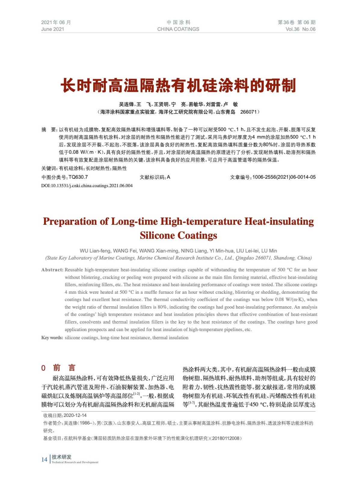 摘要:以有機硅為成膜物,復配高效隔熱填料和增強填料等,制備了一種可以耐受500 ℃、1 h,且不發生起泡、開裂、脫落可反復使用的耐高溫隔熱有機涂料。對涂層進行測試,發現該涂層具備良好的耐熱性。復配高效隔熱填料質量分數為80%時,涂層具有良好的隔熱性能。并且,對涂層的耐高溫隔熱的原理進行了分析,發現耐熱填料、助溶劑和隔熱填料等有效復配是涂層耐熱隔熱的關鍵。