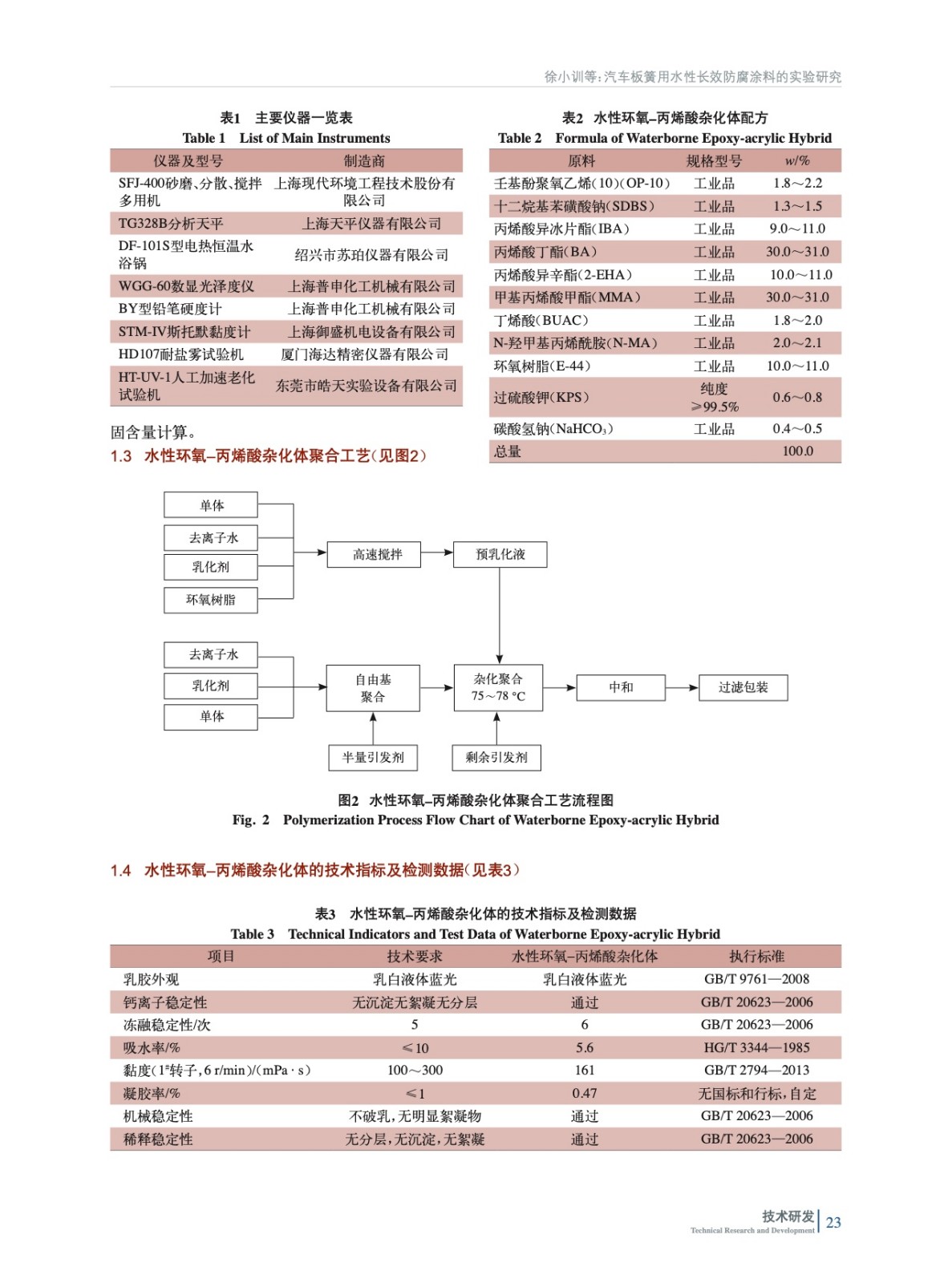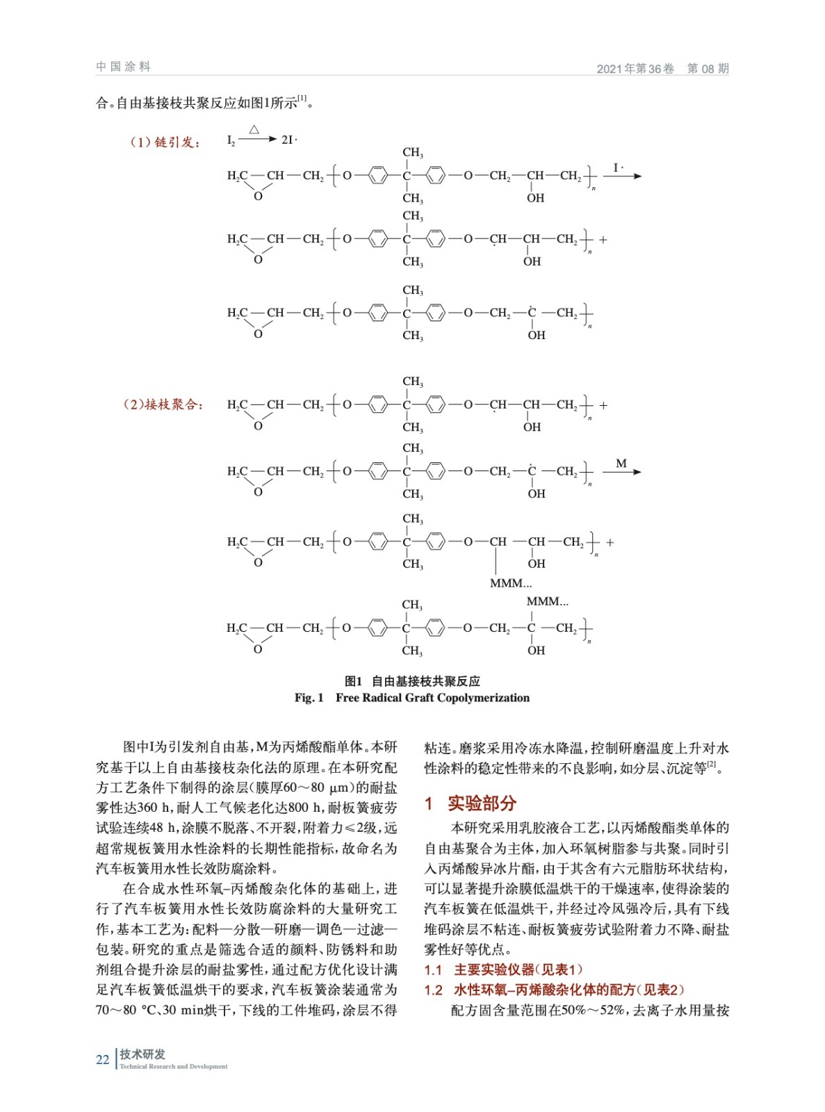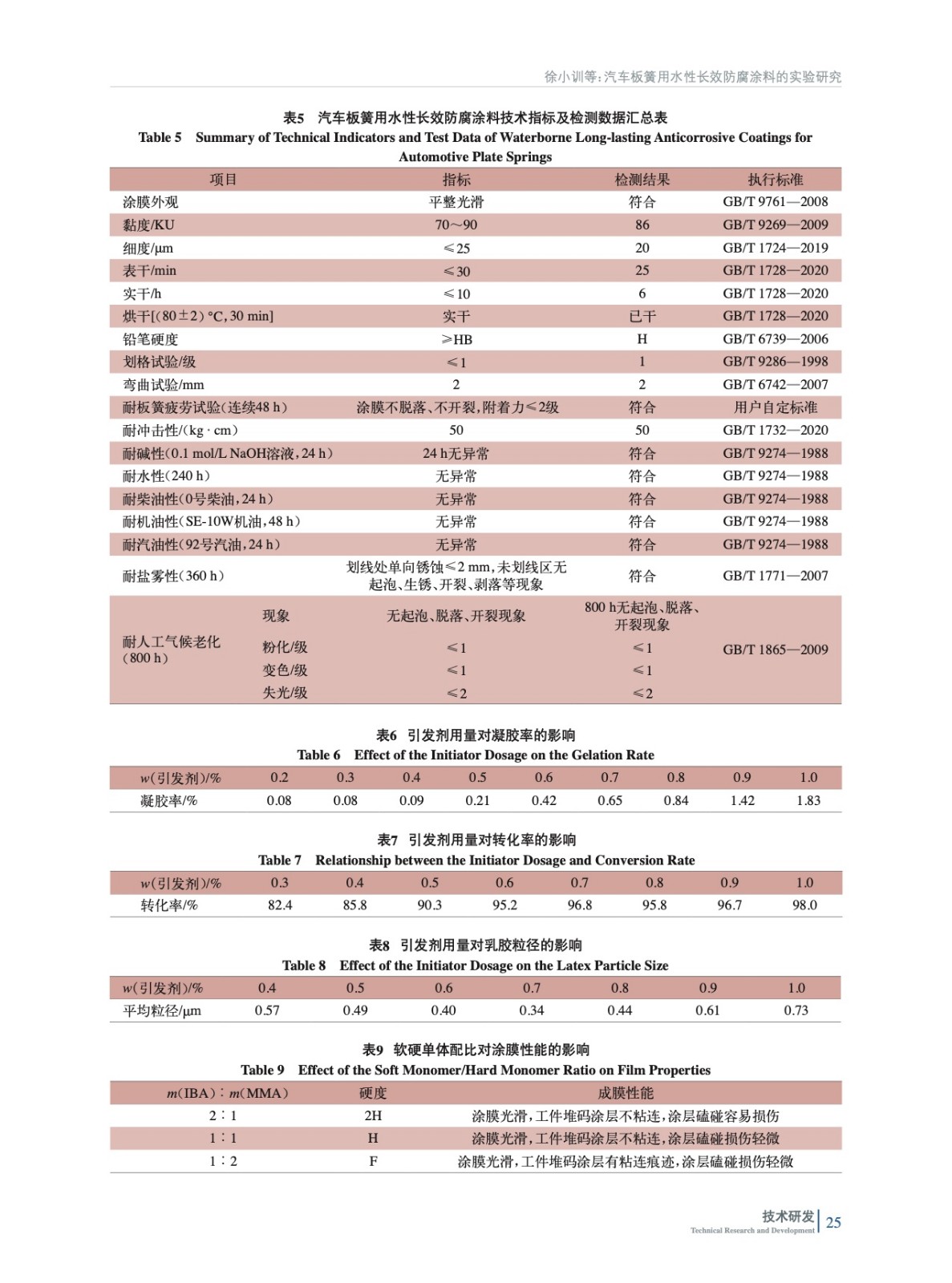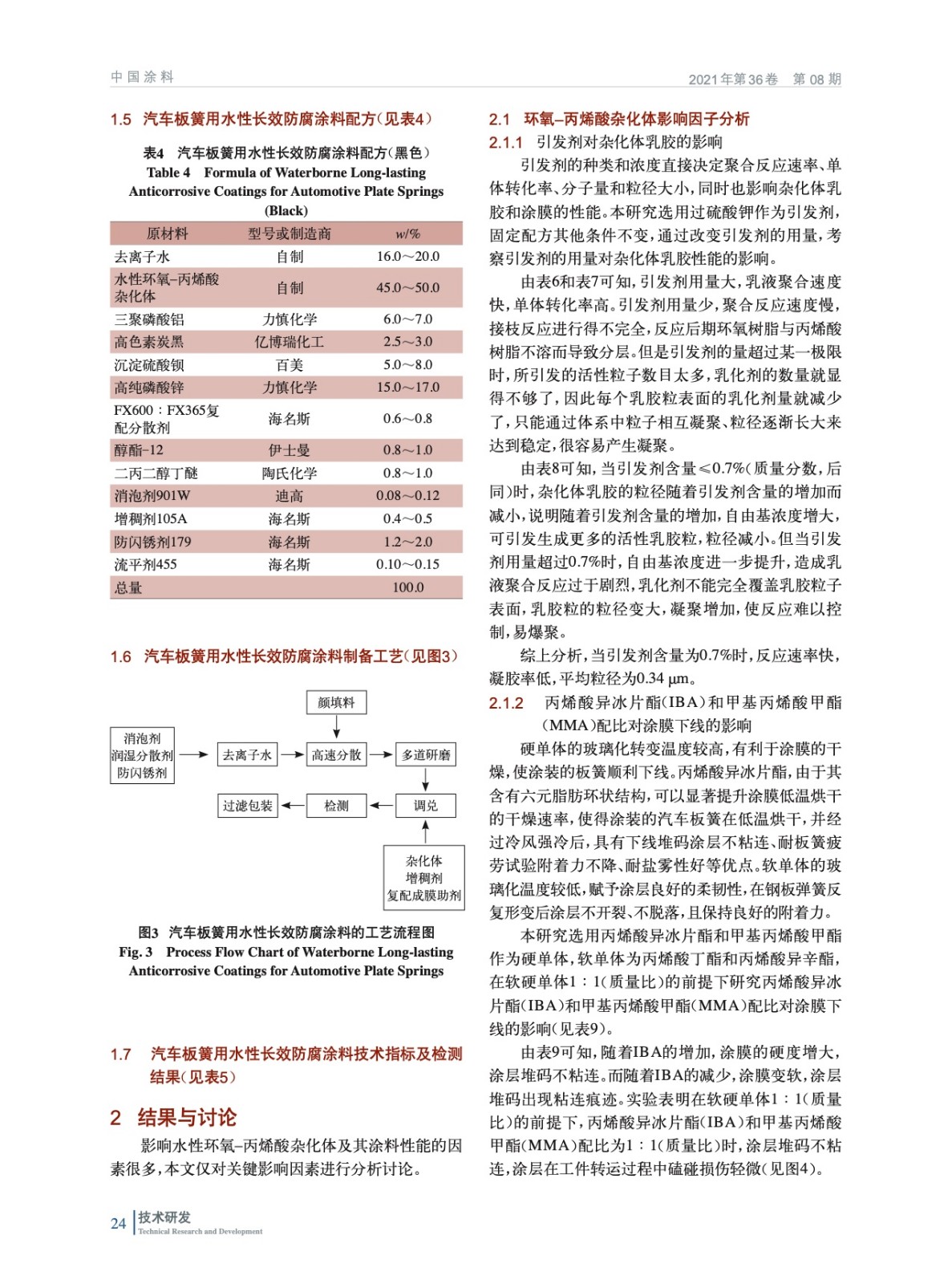 摘要:在乳液聚合體系下進行雜化反應,制備的水性環氧–丙烯酸雜化體既具有丙烯酸樹脂良好的耐候性,又具有環氧樹脂附著力強、涂膜硬度高、耐鹽霧性優異的特點。研究了引發劑、丙烯酸異冰片酯、環氧樹脂、丁烯酸等因素對乳液雜化聚合的影響。確定了汽車板簧用水性長效防腐涂料的最佳配方,探究了各種添加劑、防銹顏料對涂膜性能的影響。