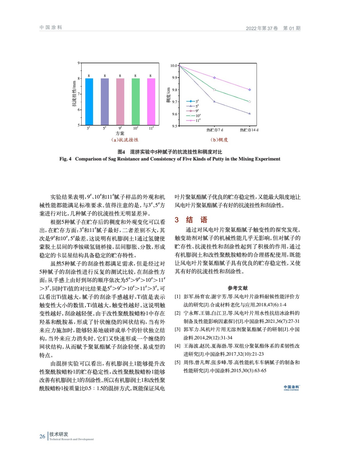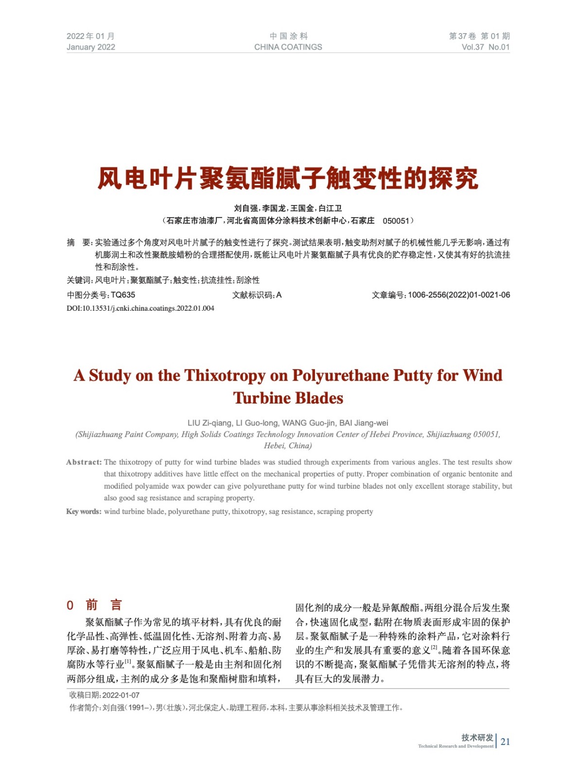 摘要:實驗通過多個角度對風(fēng)電葉片膩子的觸變性進行了探究。測試結(jié)果表明,觸變助劑對膩子的機械性能幾乎無影響,通過有機膨潤土和改性聚酰胺蠟粉的合理搭配使用,既能讓風(fēng)電葉片聚氨酯膩子具有優(yōu)良的貯存穩(wěn)定性,又使其有好的抗流掛性和刮涂性。