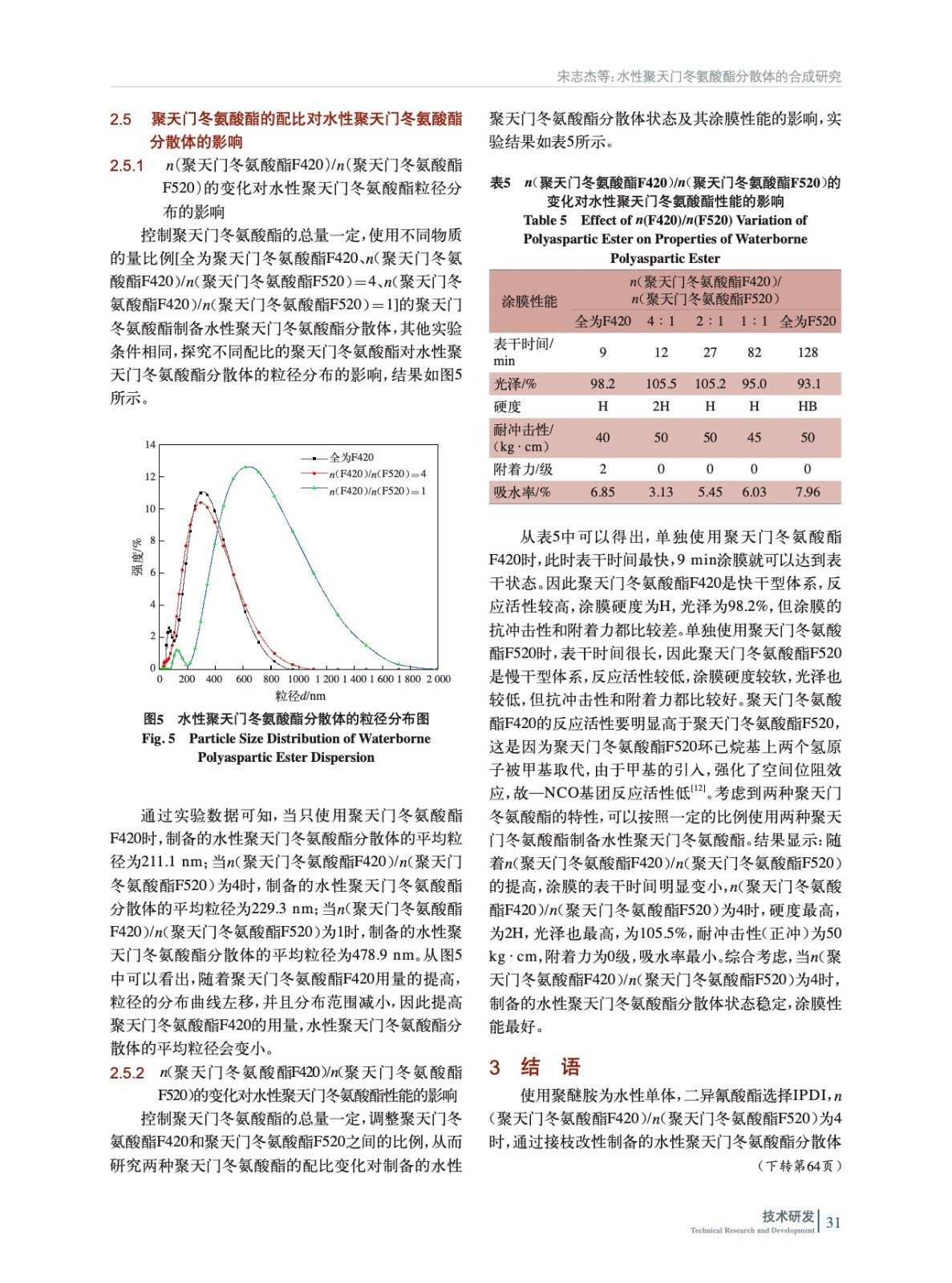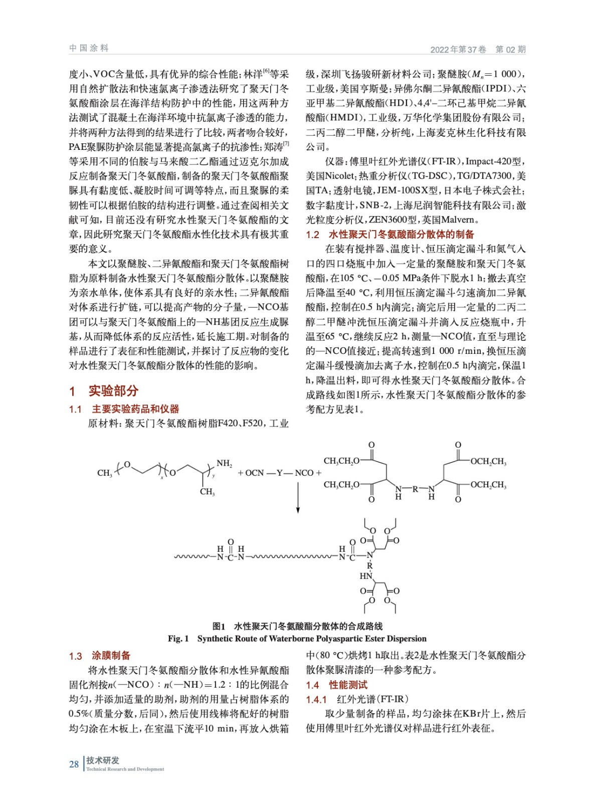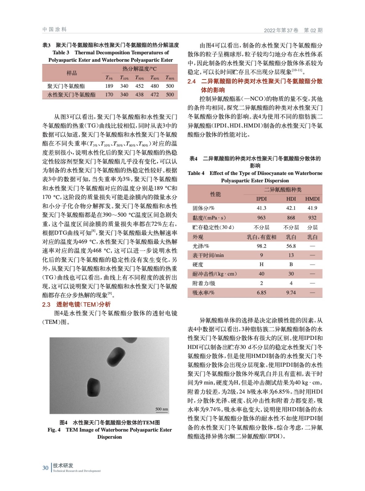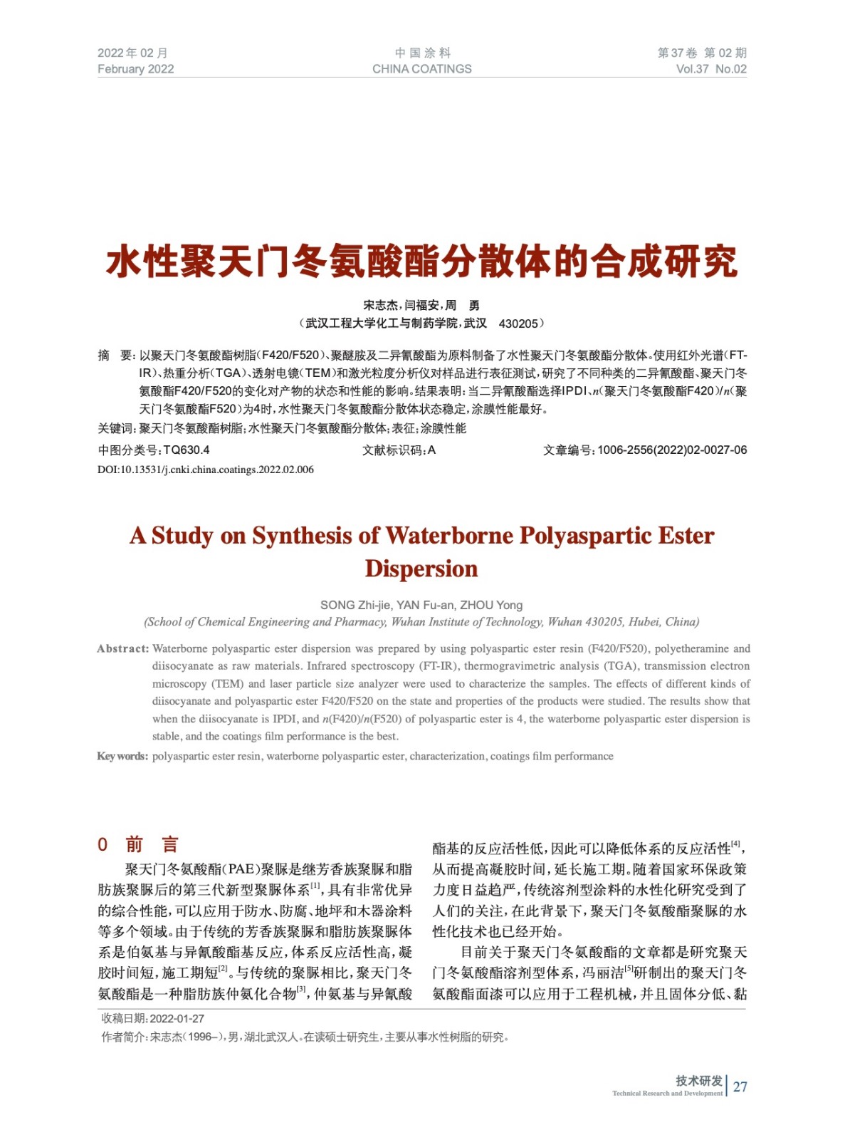 摘要:以聚天門冬氨酸酯樹脂、聚醚胺及二異氰酸酯為原料制備了水性聚天門冬氨酸酯分散體。使用紅外光譜、熱重分析、透射電鏡和激光粒度分析儀對(duì)樣品進(jìn)行表征測試,結(jié)果表明:當(dāng)二異氰酸酯選擇IPDI、n(聚天門冬氨酸酯F420)/n(聚天門冬氨酸酯F520)為4時(shí),水性聚天門冬氨酸酯分散體狀態(tài)穩(wěn)定,涂膜性能最好。