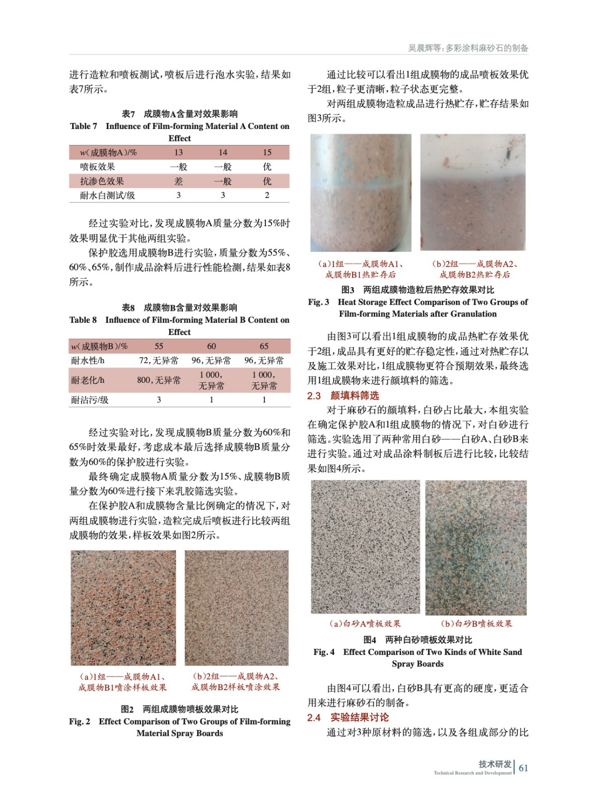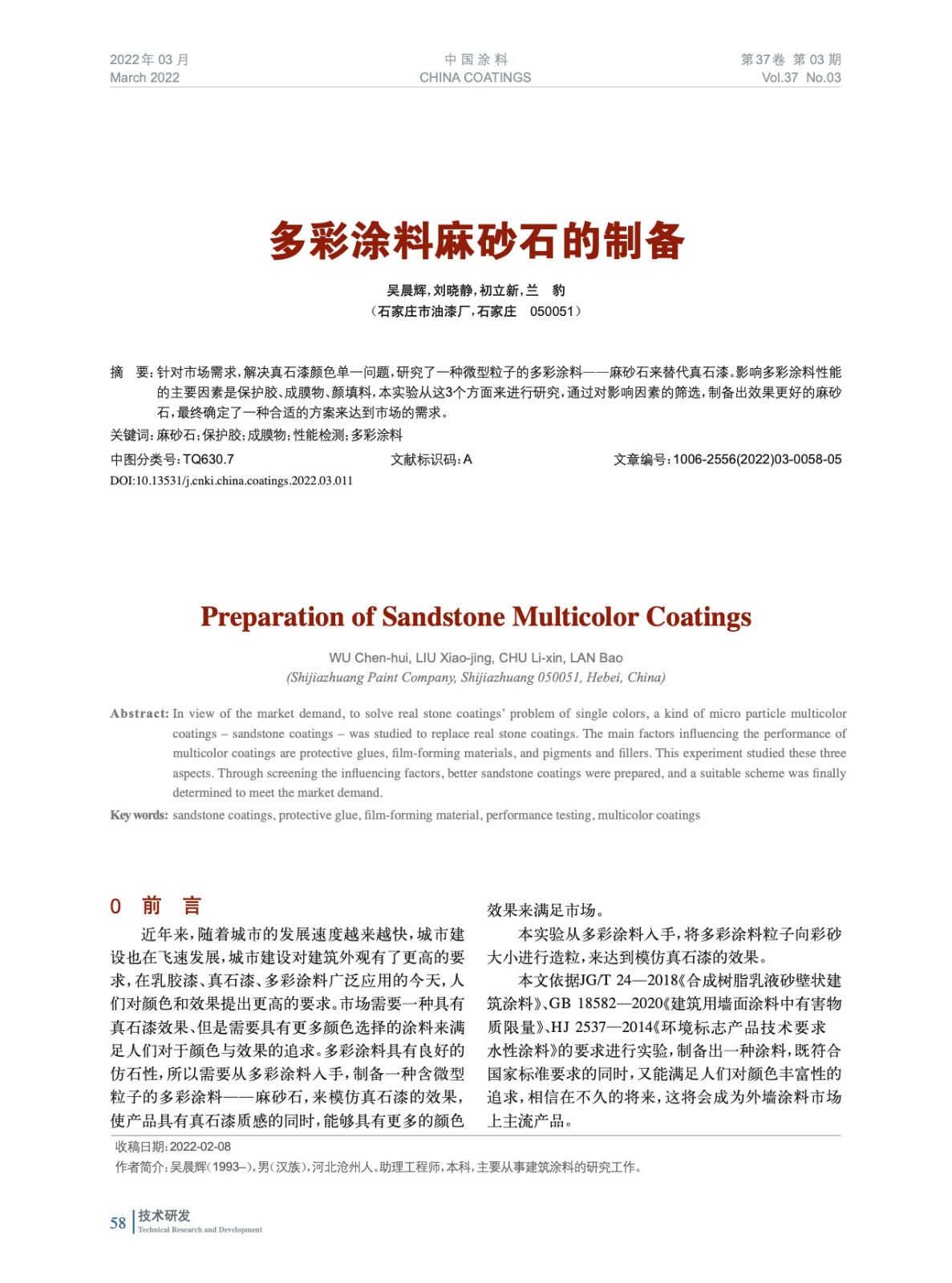 摘要:針對市場需求,解決真石漆顏色單一問題,研究了一種微型粒子的多彩涂料——麻砂石來替代真石漆。影響多彩涂料性能的主要因素是保護(hù)膠、成膜物、顏填料,本實驗從這3個方面來進(jìn)行研究,通過對影響因素的篩選,制備出效果更好的麻砂石,最終確定了一種合適的方案來達(dá)到市場的需求。