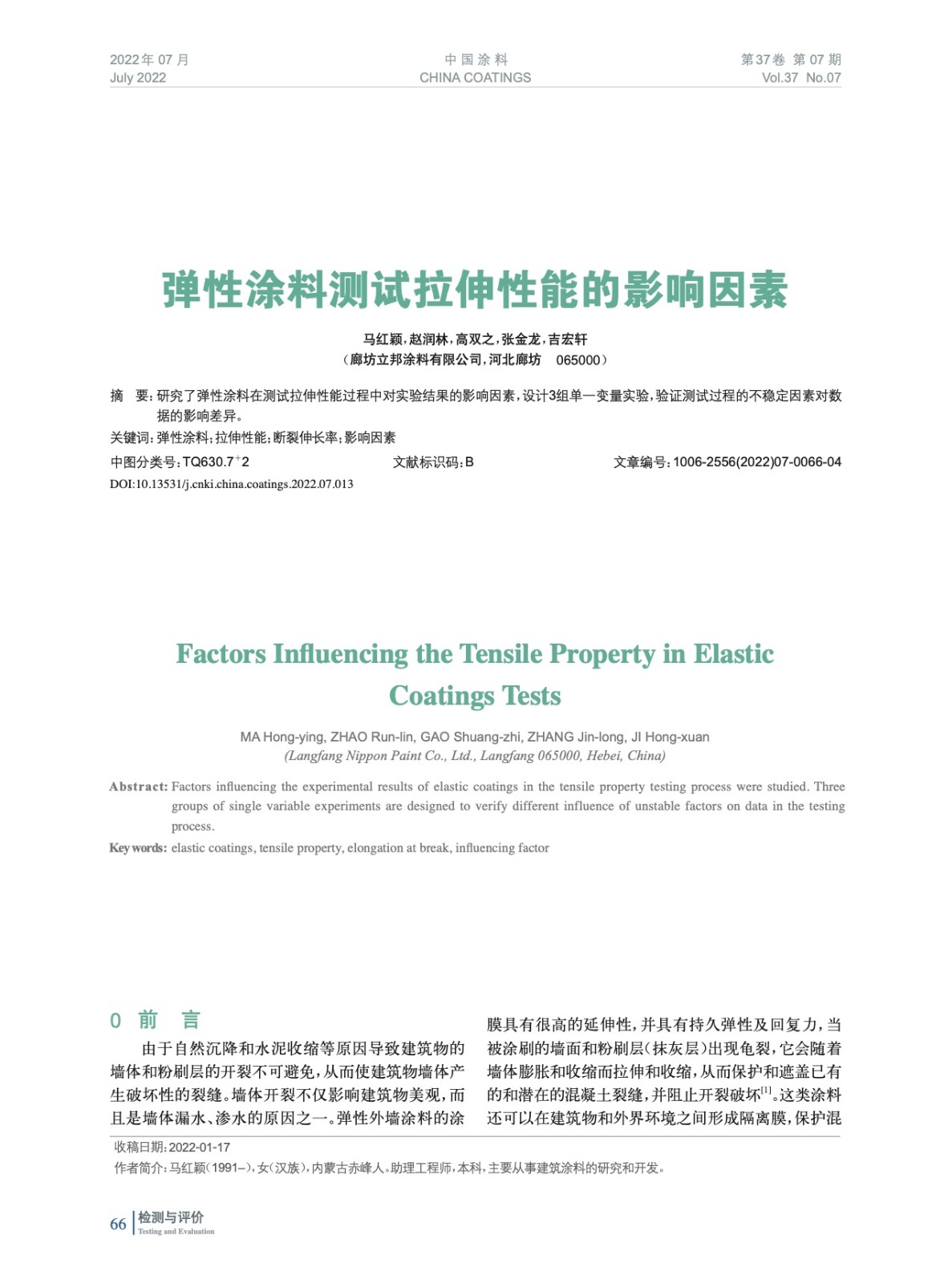 本文系作者@馬紅穎,趙潤林,高雙之,張金龍,吉宏軒 授權中國涂料網發表,并經中國涂料網編輯,未經允許不得轉載,如需轉載請聯系chinacoatingnet@vip.163.com