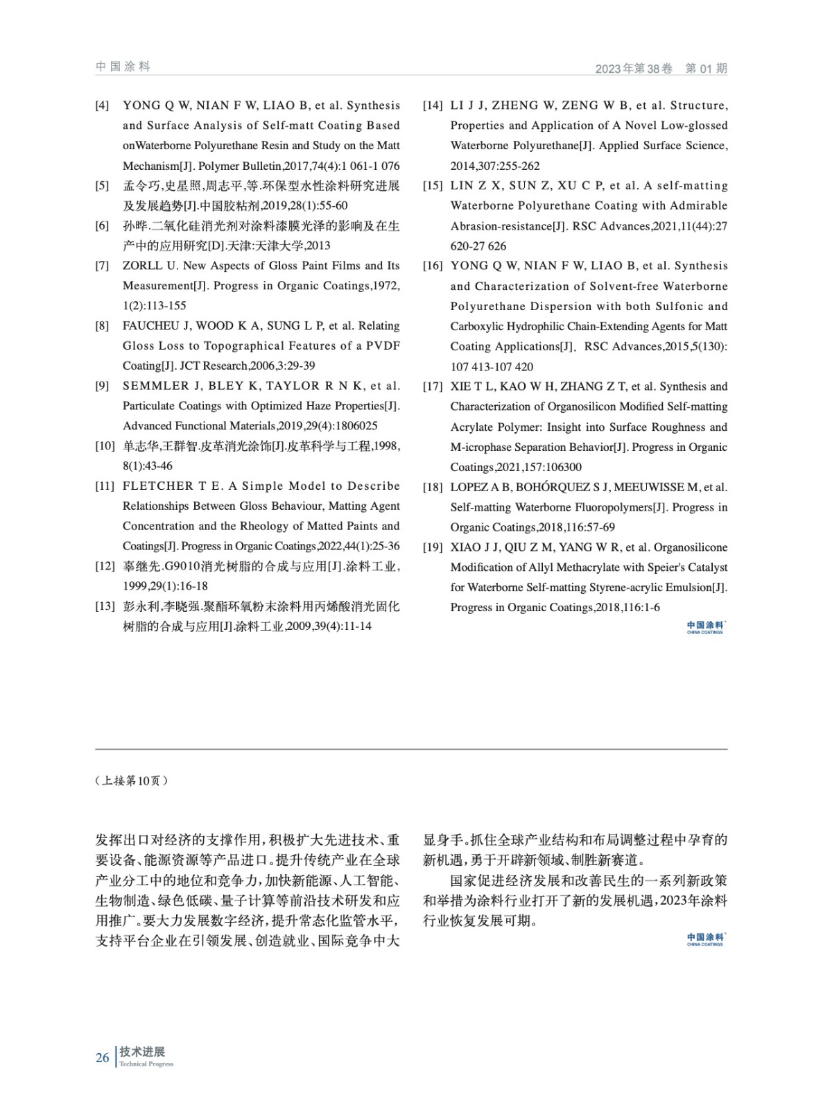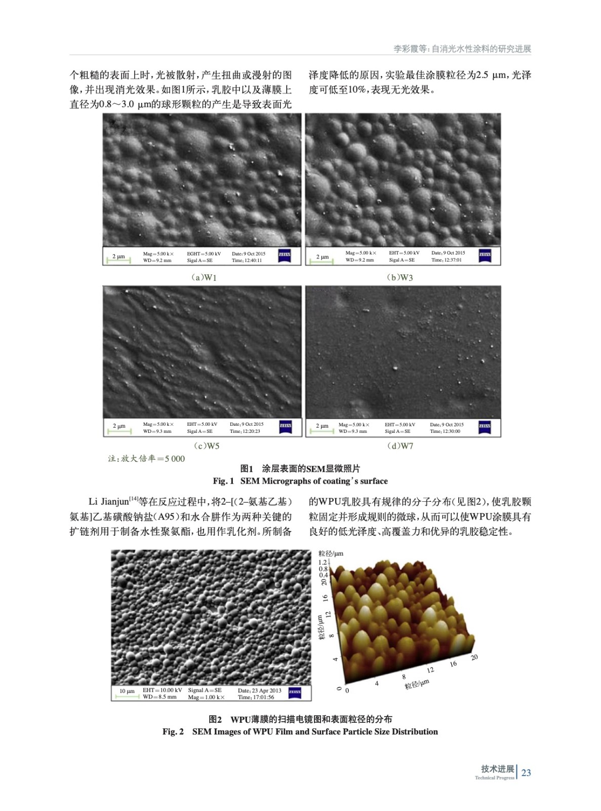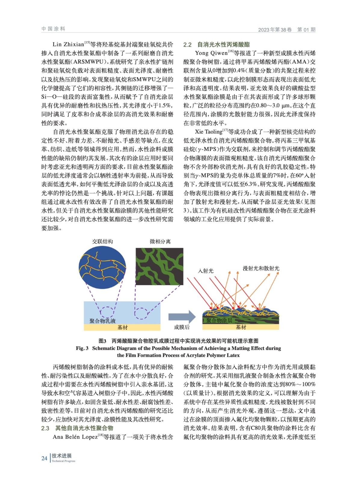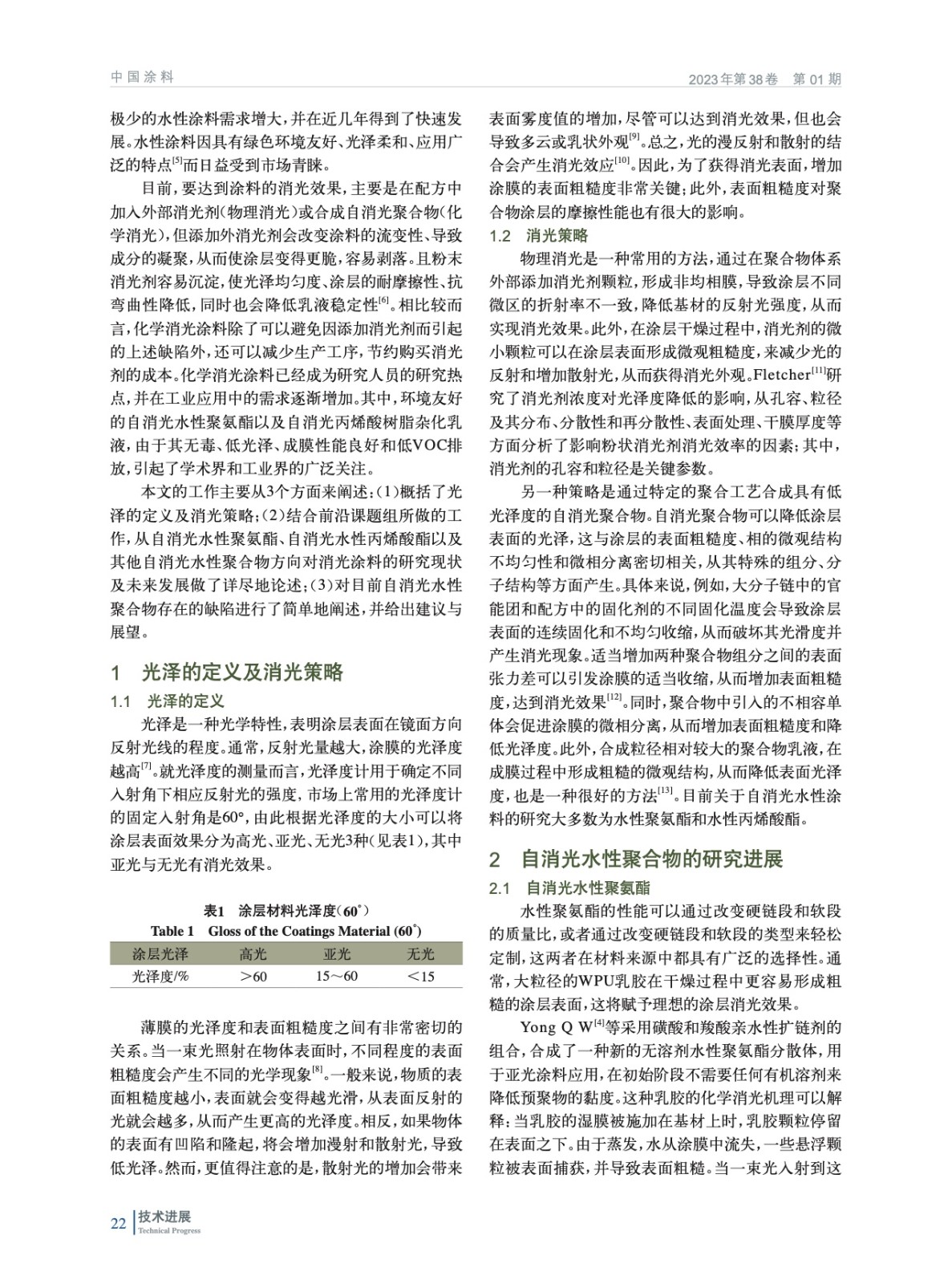 從光澤度和消光策略兩個方面介紹自消光涂料的消光機理,對目前自消光水性涂料的研究現狀及進展進行了系統論述,并對自消光水性聚合物目前存在的缺陷進行了簡單闡述,給出了建議與展望。
