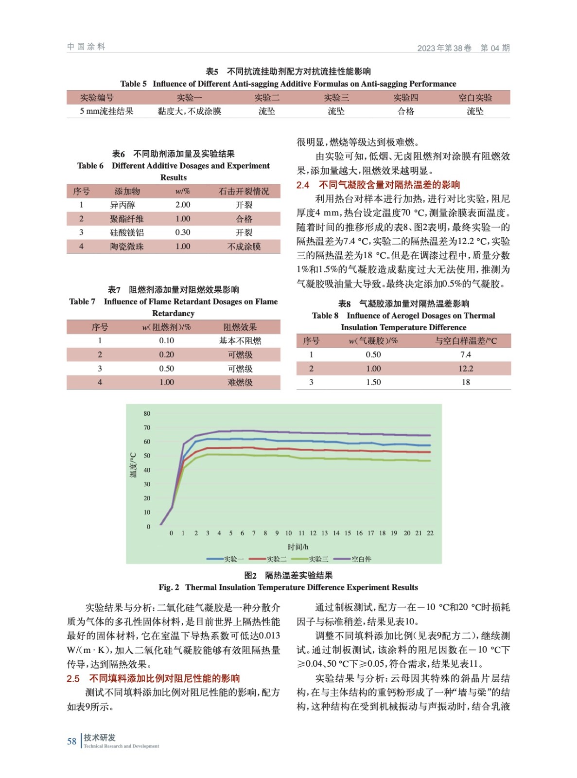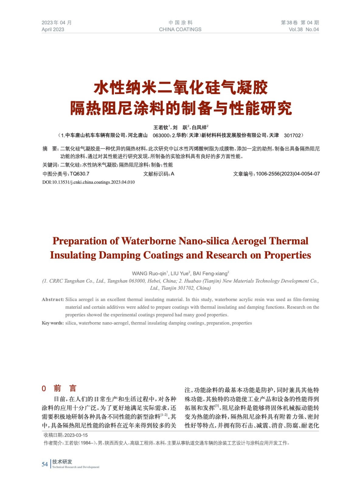 二氧化硅氣凝膠是一種優異的隔熱材料,此次研究中以水性丙烯酸樹脂為成膜物,添加一定的助劑,制備出具備隔熱阻尼功能的涂料。通過對其性能進行研究發現,所制備的實驗涂料具有良好的多方面性能。