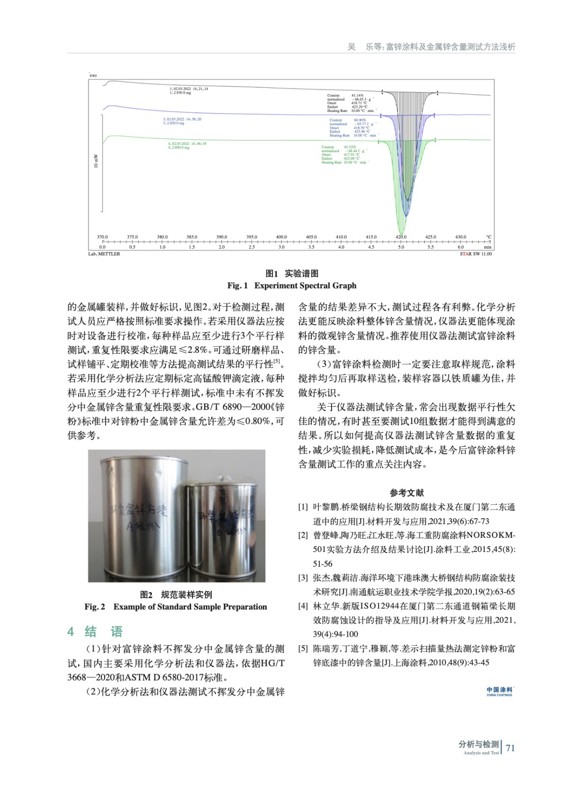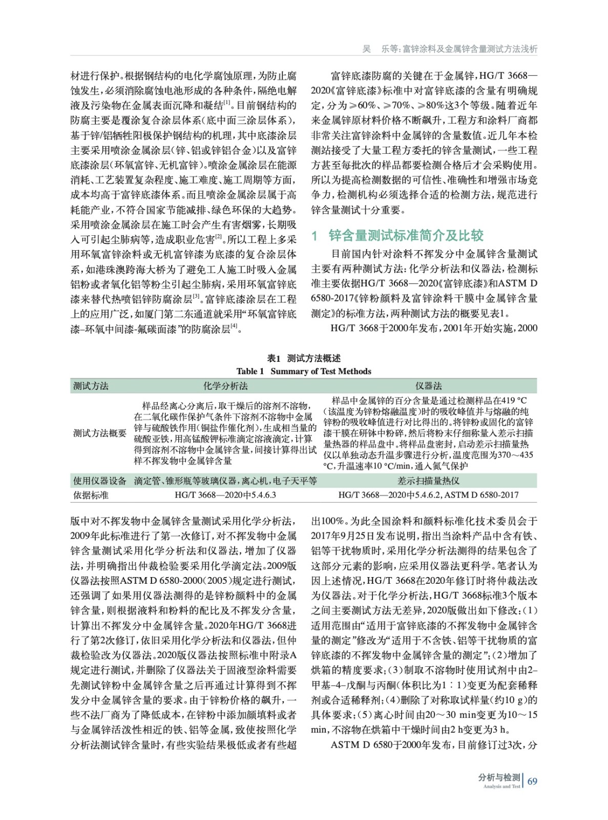 介紹了富鋅底漆測試時常用的檢測方法及測試依據標準,并介紹了HG/T 3668—2020和ASTM D 6580-2017兩個標準近來關于鋅含量測試部分的修訂變更情況。針對涂料中鋅含量檢測出現的問題,指出了規范的做法,并通過實例測試和結合以往經驗,對比了兩種測試方法的優缺點。
