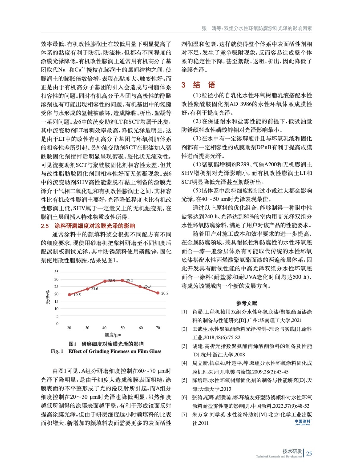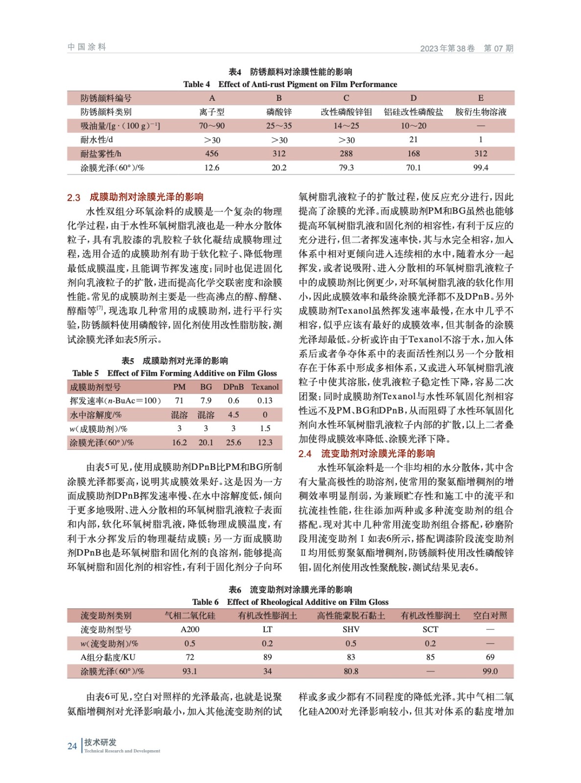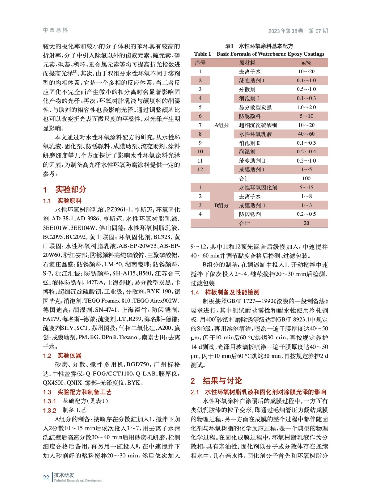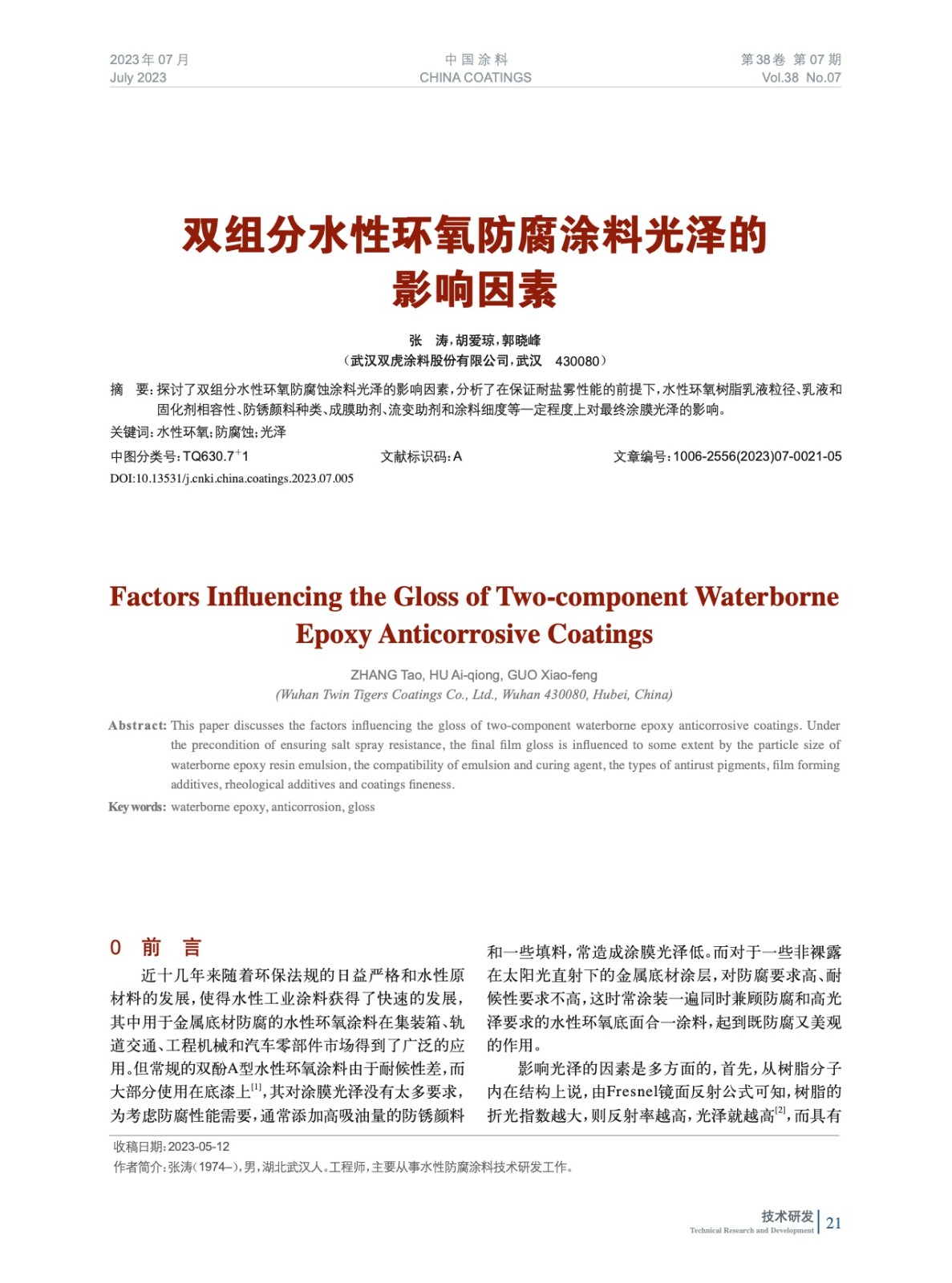 探討了雙組分水性環氧防腐蝕涂料光澤的影響因素,分析了在保證耐鹽霧性能的前提下,水性環氧樹脂乳液粒徑、乳液和固化劑相容性、防銹顏料種類、成膜助劑、流變助劑和涂料細度等一定程度上對最終涂膜光澤的影響。