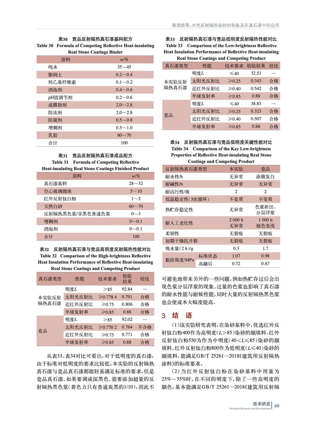 摘要:研究了不同的顏填料種類以及用量對反射隔熱染砂的耐磨性、耐水性、耐溶劑性、耐人工老化性以及反射隔熱性能的影響。結果表明:當紅外反射鈦白粉用量在25%~35%(質量分數,后同),人工染砂乳膠用量在40%~45%,雜化交聯劑用量在0.1%~0.15%,與天然雪花白進行染色處理,其制得的反射隔熱染砂,不僅具有優異的機械穩定性、顏色均勻度,而且具有優異的貯存穩定性、耐水性、耐酸性、耐堿性和耐人工老化性,添加在真石漆中具有優異的反射隔熱性能。