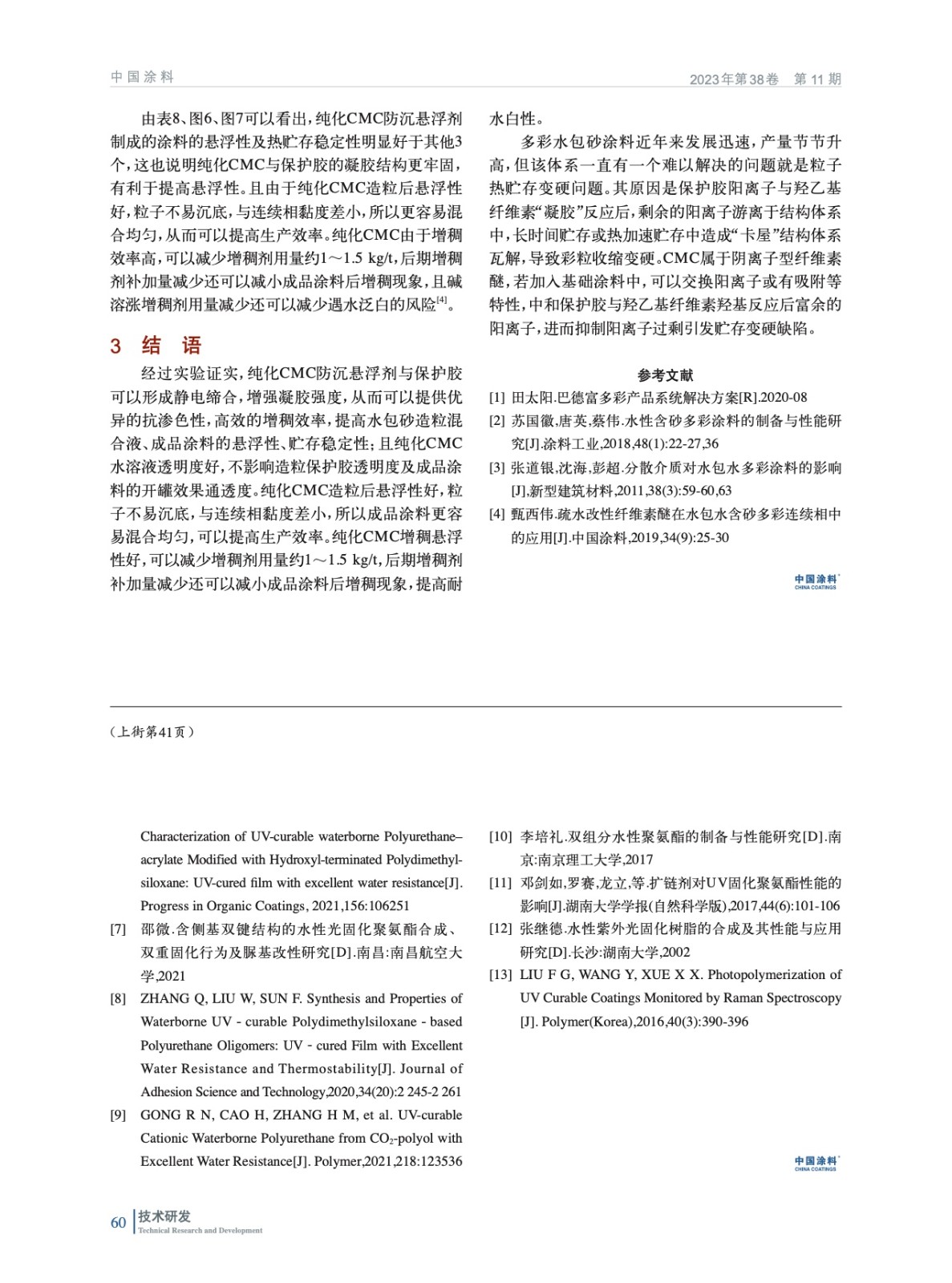 通過測試不同種類的防沉懸浮劑水溶液的耐水白性、防沉懸浮劑在造粒保護膠中的增稠效果、基礎涂料尤其是深色基礎涂料加入造粒保護膠后的抗滲色性及防沉懸浮性、成品涂料的加速貯存穩定性等,優選出了純化改性CMC作為水包砂多彩涂料的助劑時,產品的防沉劑懸浮性最優。