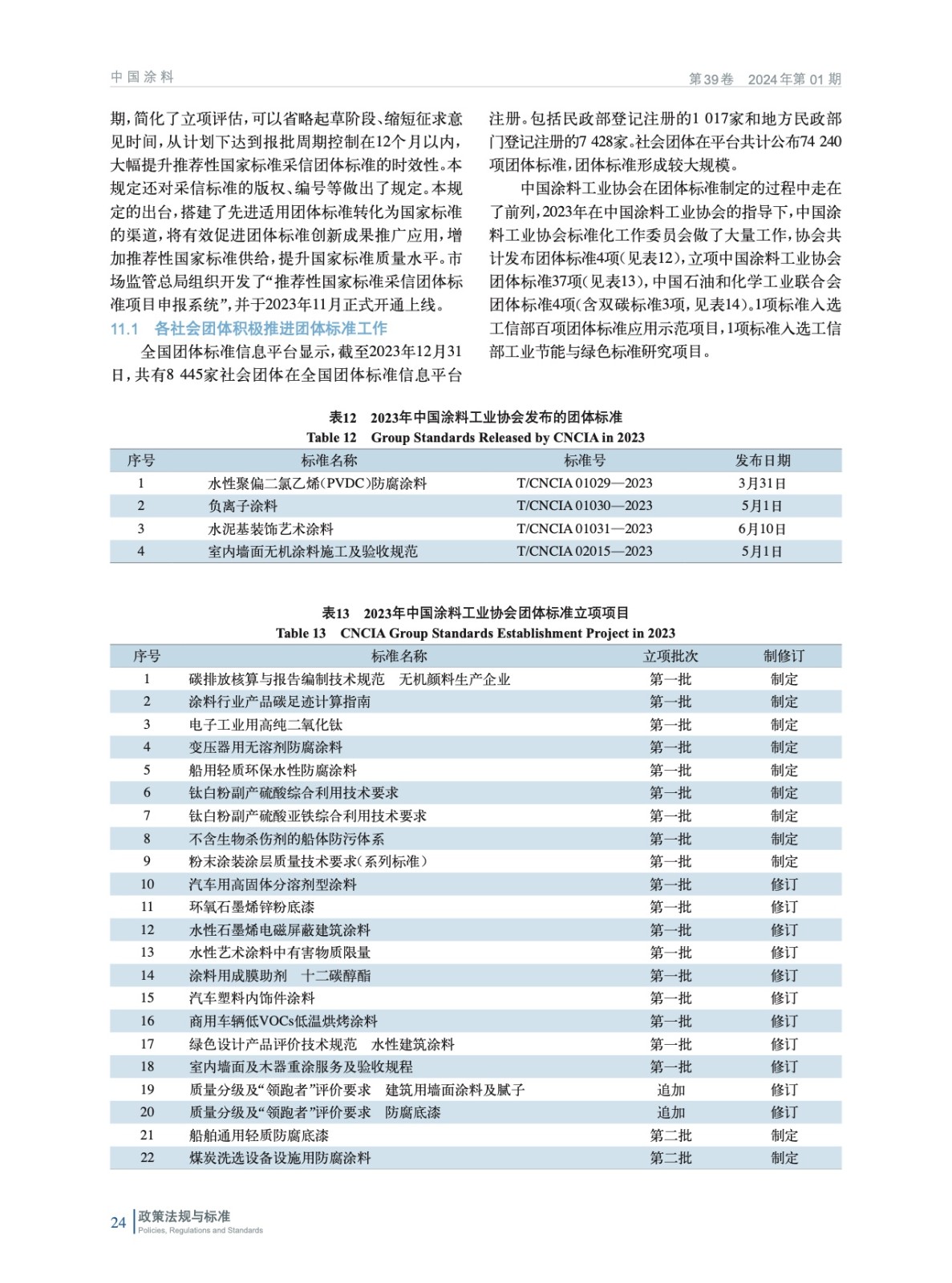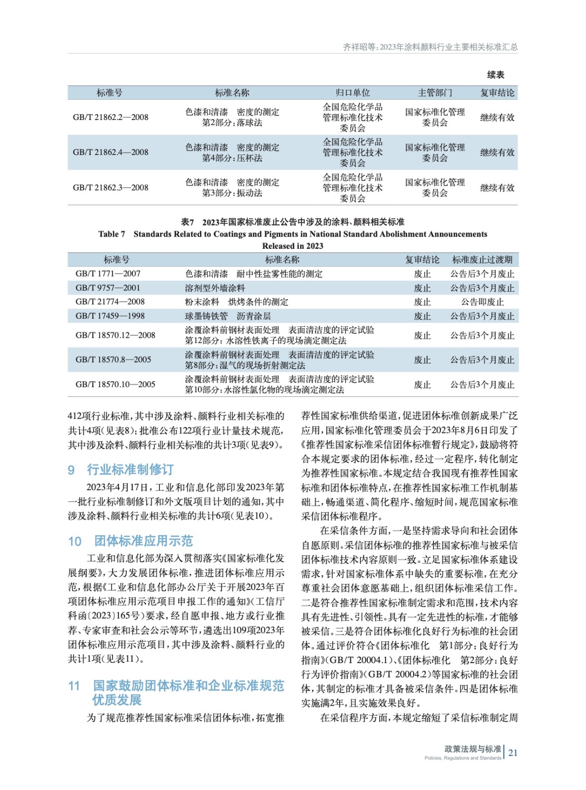 摘要:2023年,涂料、顏料相關(guān)標(biāo)準(zhǔn)得以進(jìn)一步完善。國(guó)家標(biāo)準(zhǔn)年度復(fù)審工作有序進(jìn)行,推進(jìn)標(biāo)準(zhǔn)更新升級(jí);標(biāo)準(zhǔn)體系進(jìn)一步優(yōu)化,持續(xù)提高標(biāo)準(zhǔn)質(zhì)量水平;持續(xù)完善國(guó)家標(biāo)準(zhǔn)樣品體系;推動(dòng)推薦性國(guó)家標(biāo)準(zhǔn)采信團(tuán)體標(biāo)準(zhǔn),引領(lǐng)團(tuán)體標(biāo)準(zhǔn)高水平供給,提高團(tuán)體標(biāo)準(zhǔn)公信力。推動(dòng)實(shí)施標(biāo)準(zhǔn)創(chuàng)新型企業(yè)梯度培育工作,積極培育標(biāo)準(zhǔn)創(chuàng)新型企業(yè);開(kāi)展企業(yè)標(biāo)準(zhǔn)“領(lǐng)跑者”認(rèn)證工作,引導(dǎo)企業(yè)爭(zhēng)創(chuàng)一批高質(zhì)量標(biāo)準(zhǔn)。