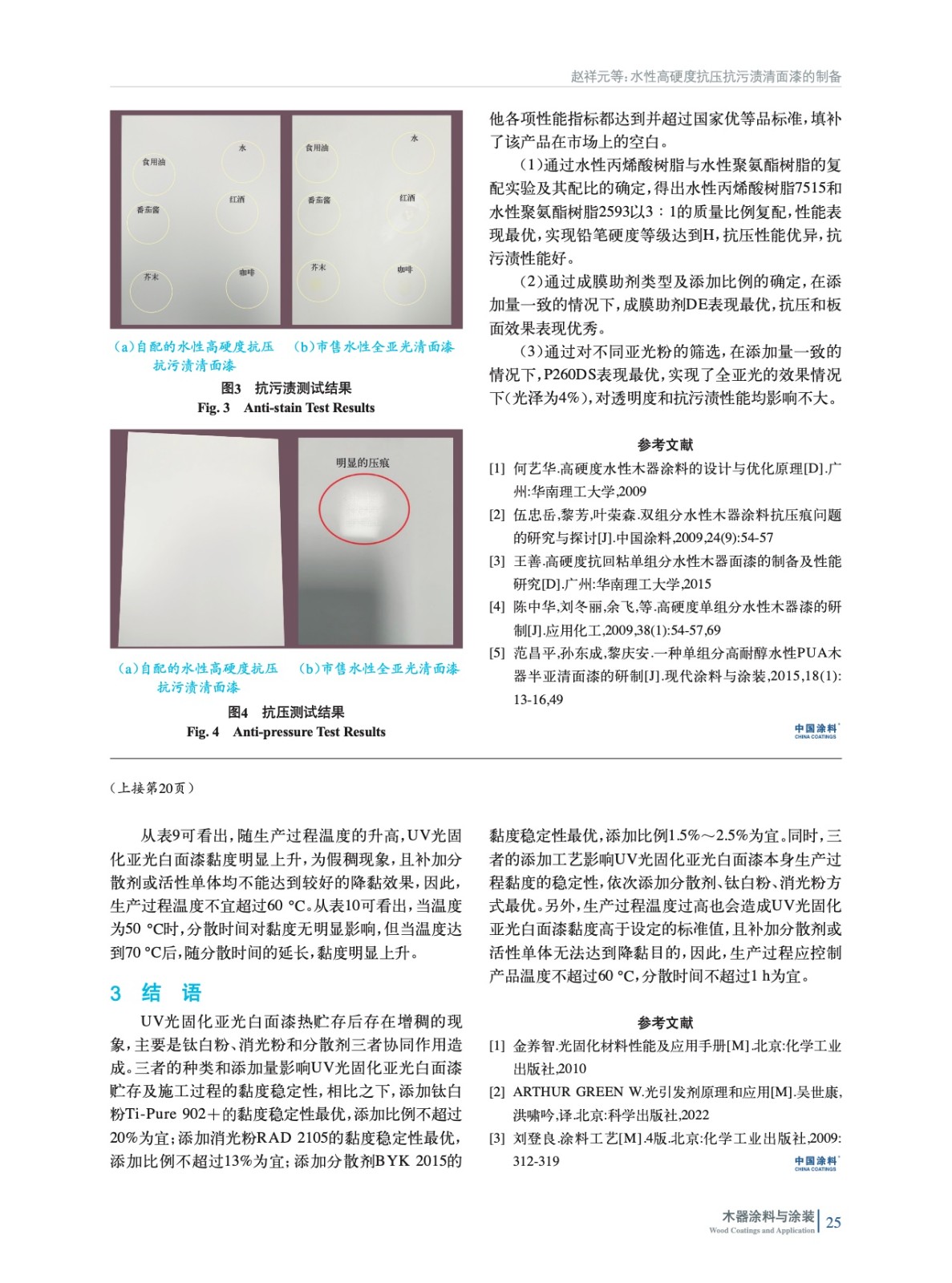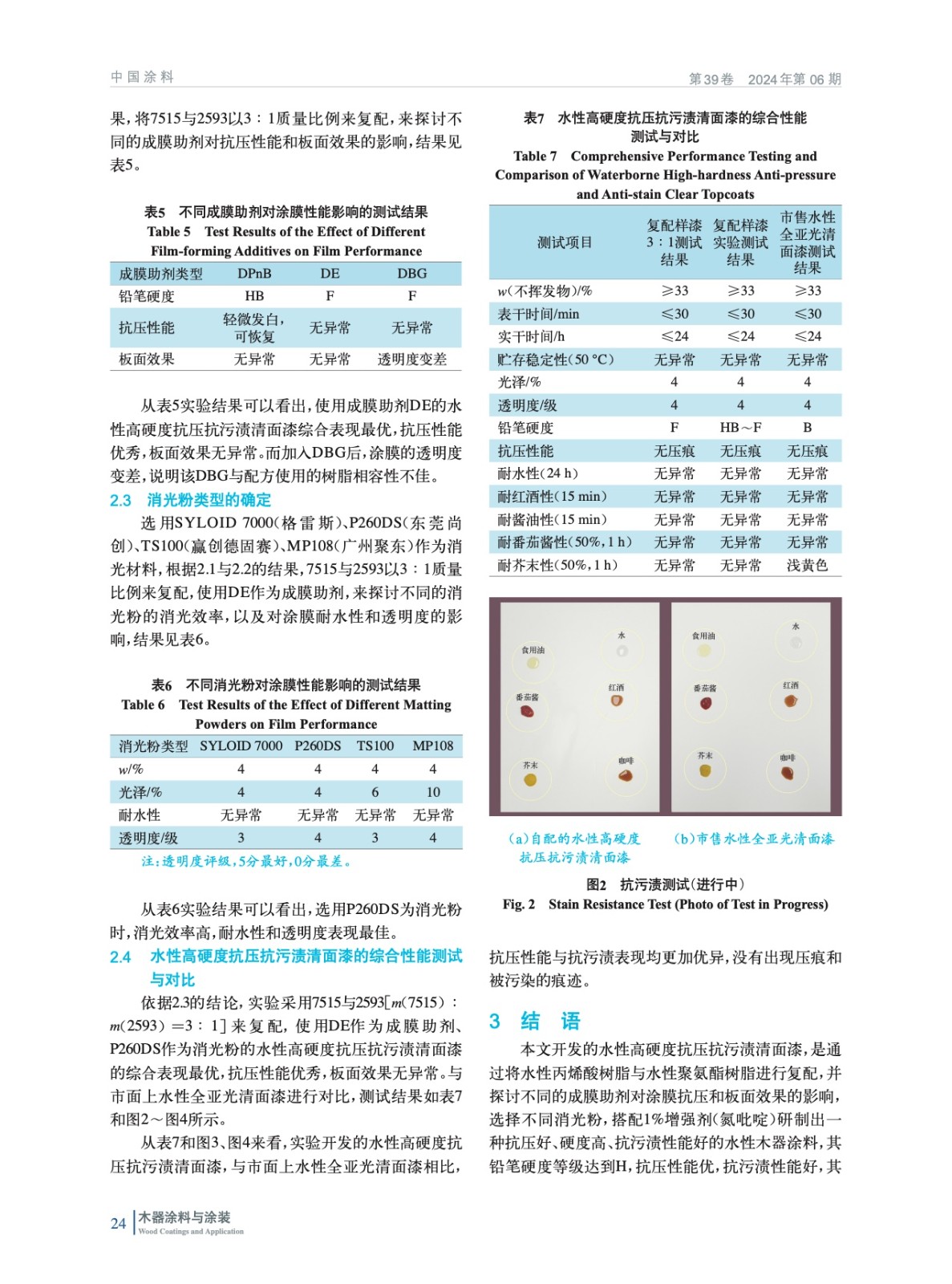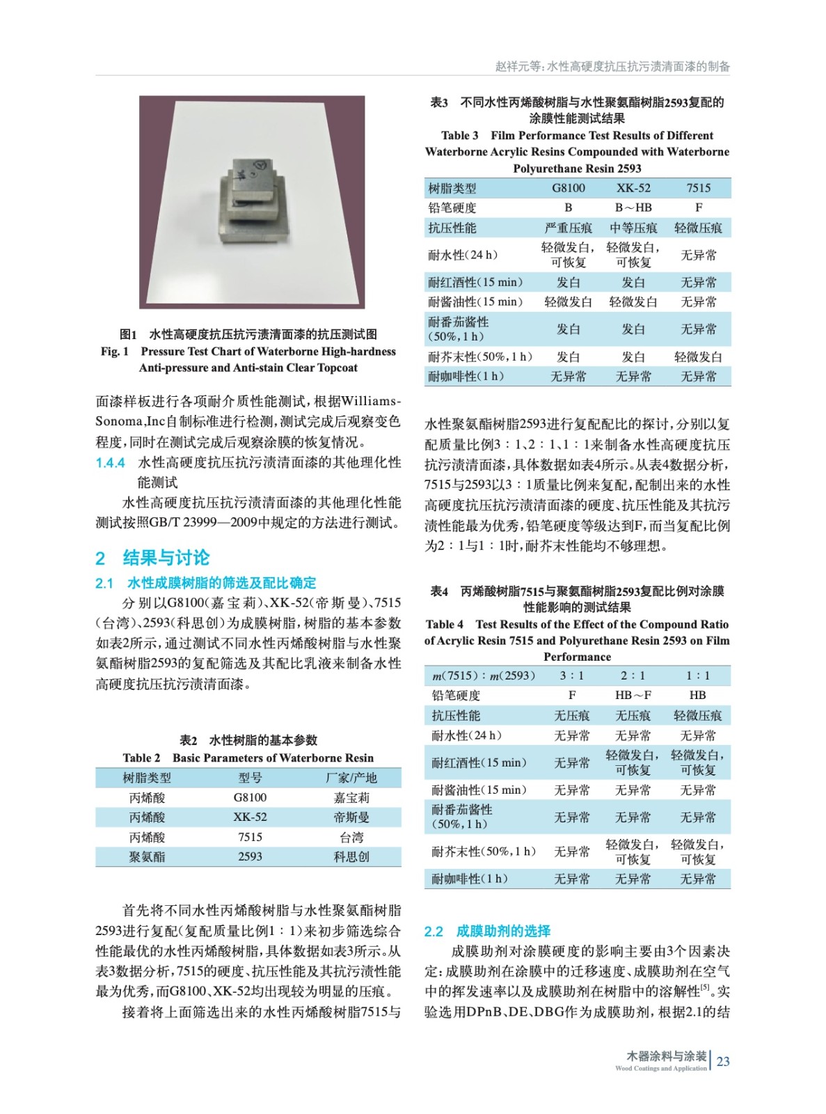 摘要:以水性樹脂、消光粉和其他助劑為原料,通過配方優(yōu)化改進(jìn),制備了一種抗壓抗污漬高硬度的水性清面漆。探討了不同水性丙烯酸樹脂與水性聚氨酯樹脂的復(fù)配篩選及其配比、不同的成膜助劑和消光粉的種類對最終研制的水性全亞光(光澤為2%~5%)高硬度抗壓抗污漬清面漆的硬度、抗壓性能、抗污漬性和透明度的影響。按照GB/T 6739—2006《色漆和清漆鉛筆法測定漆膜硬度》標(biāo)準(zhǔn)進(jìn)行測試,對涂膜的硬度進(jìn)行評估。結(jié)果表明:當(dāng)配方采用水性樹脂7515與2593[復(fù)配比例m(7515)∶m(2593)=3∶1]、成膜助劑DE、消光粉P260DS時,搭配質(zhì)量分?jǐn)?shù)1%的增強劑(氮吡啶),最終開發(fā)的水性高硬度抗壓抗污漬清面漆的涂膜抗壓性能、硬度表現(xiàn)和抗污漬均達(dá)到最佳,其中鉛筆硬度等級達(dá)到F。