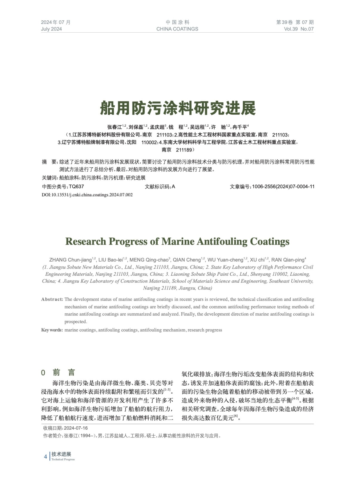 本文系作者@張春江,劉保磊,孟慶超,錢 程,吳遠程,許 馳,冉千平 授權中國涂料網發表,并經中國涂料網編輯,未經允許不得轉載,如需轉載請聯系chinacoatingnet@vip.163.com