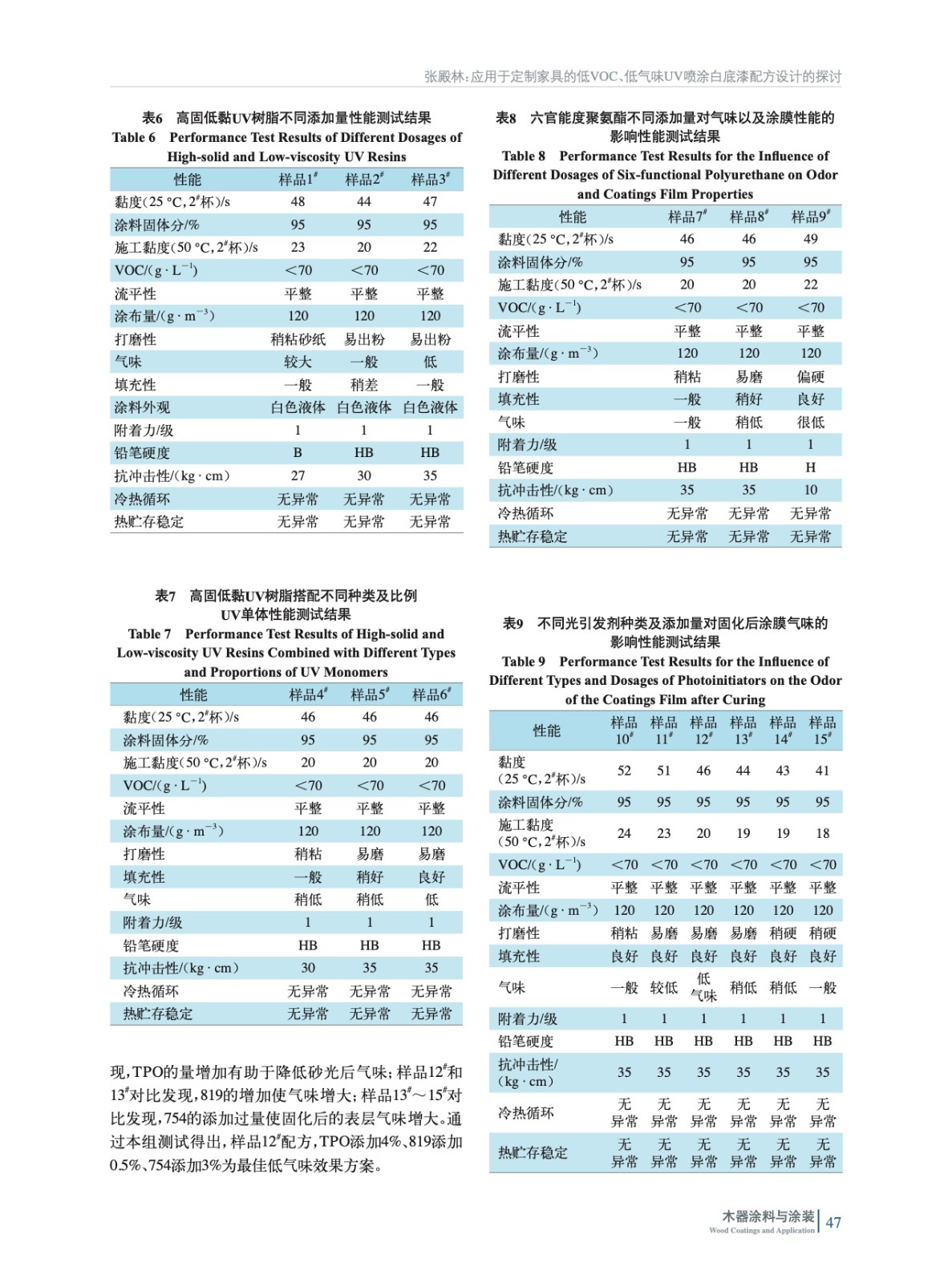 摘要:主要通過使用高固低黏的UV樹脂搭配UV單體減少有機(jī)溶劑添加量,以及添加一定比例的高官能度聚氨酯和深層光引發(fā)劑來實(shí)現(xiàn)深層固化的交聯(lián)密度,通過對(duì)光引發(fā)劑的復(fù)配與不同比例的添加,來進(jìn)一步降低固化后氣味。同時(shí)對(duì)層間連涂測試以及在配方設(shè)計(jì)時(shí)遇到的一些其他需要注意事項(xiàng)做了介紹。