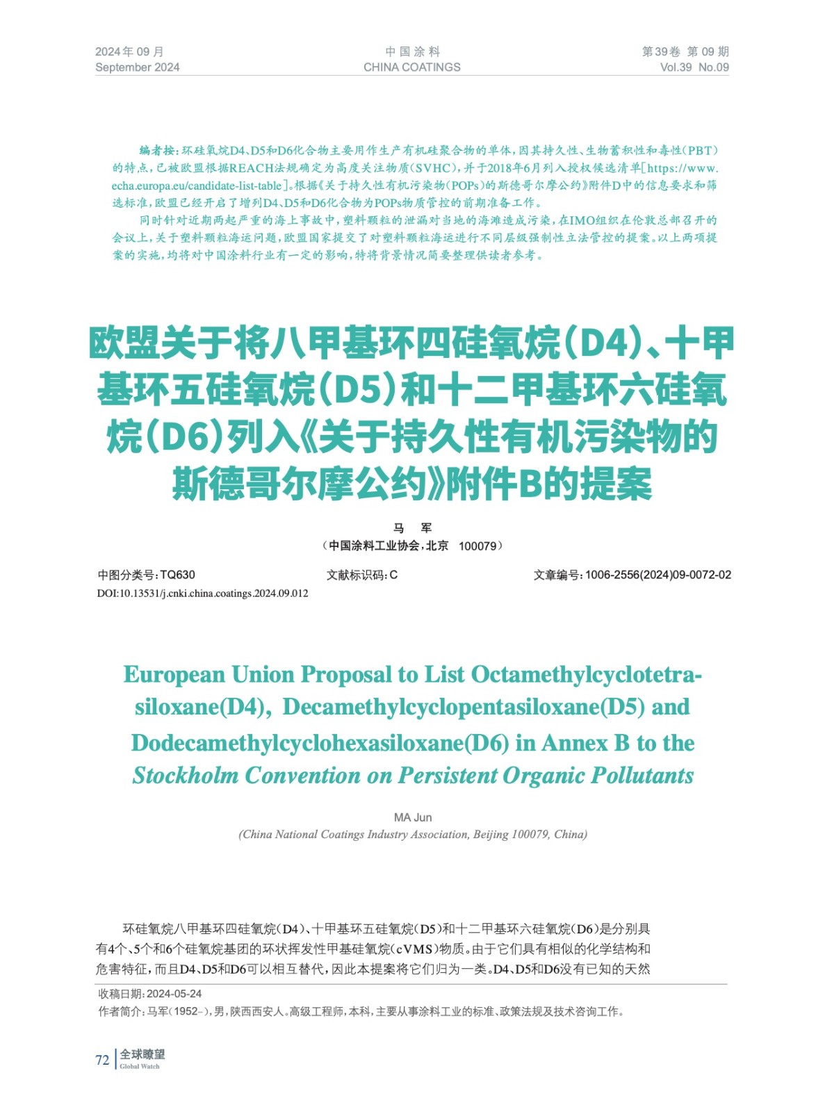 歐盟關于將八甲基環四硅氧烷(D4)、十甲基環五硅氧烷(D5)和十二甲基環六硅氧烷(D6)列入《關于持久性有機污染物的斯德哥爾摩公約》附件B的提案