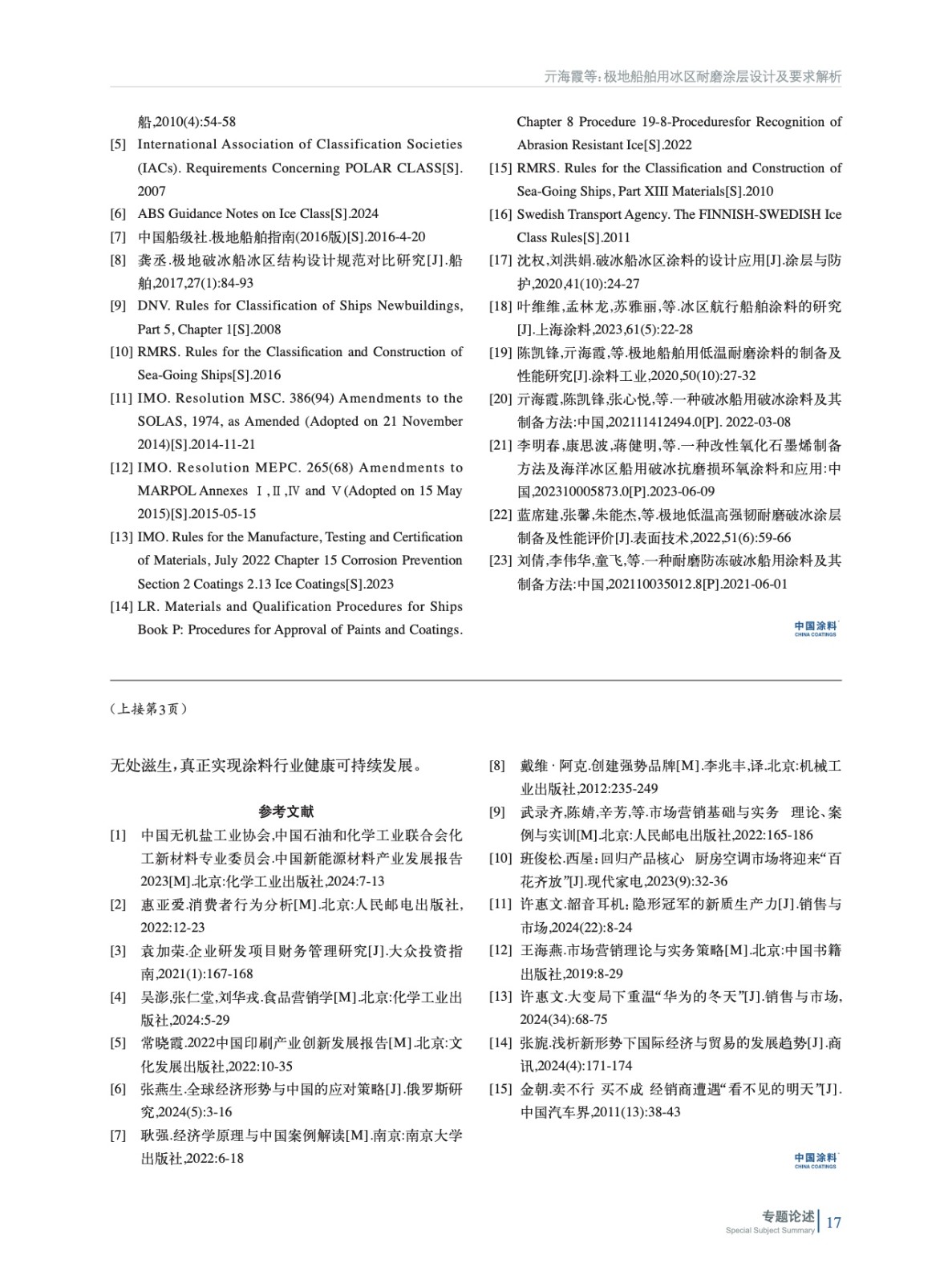 分析了不同船級社及團體對于冰區船舶的冰級分類,并通過冰級確定極地船舶的分類,從而確定冰區耐磨涂料在極地船舶上的應用需求。總結各船級社對于冰區耐磨涂料的應用要求,并調研國內外相關產品,為我國冰區耐磨涂料的國產化發展提供指導。
