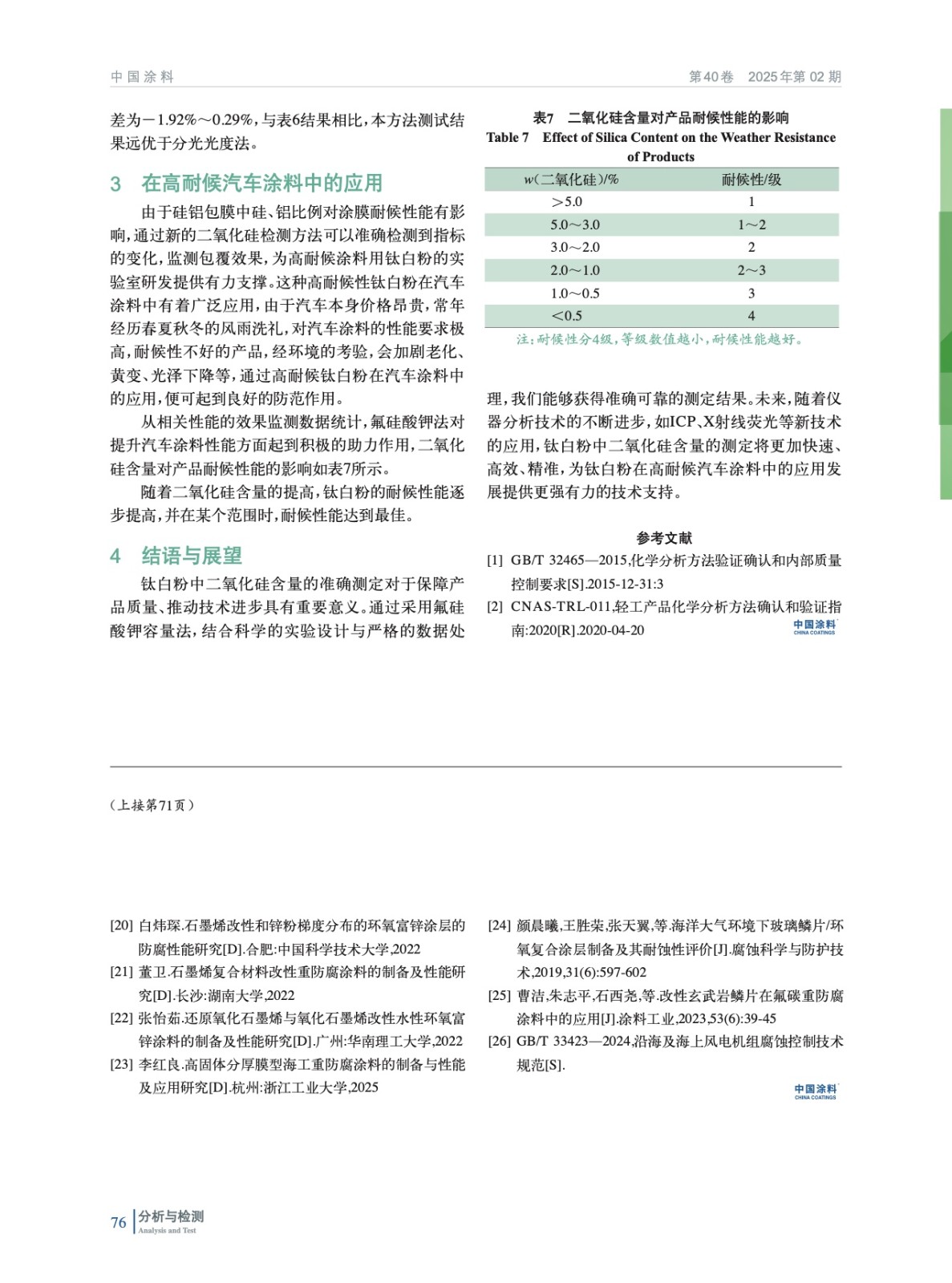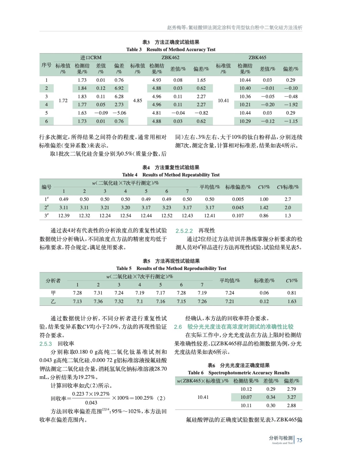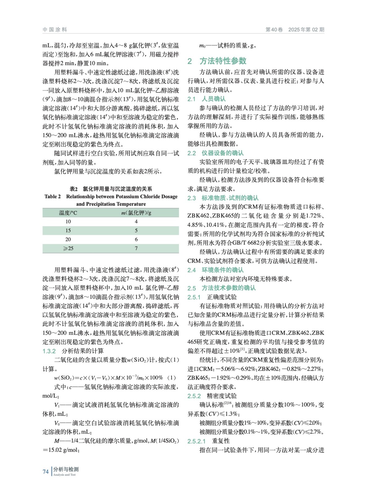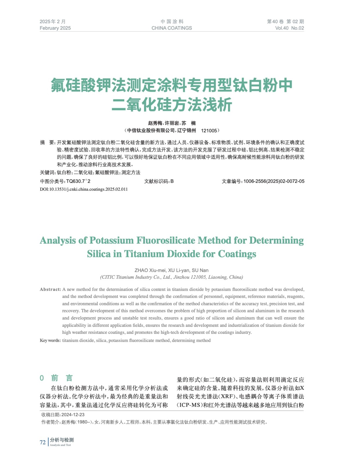 摘要:開發氟硅酸鉀法測定鈦白粉二氧化硅含量的新方法,通過人員、儀器設備、標準物質、試劑、環境條件的確認和正確度試驗、精密度試驗、回收率的方法特性確認,完成方法開發。該方法的開發克服了研發過程中硅、鋁比例高、結果檢測不穩定的問題,確保了良好的硅鋁比例,可以很好地保證鈦白粉在不同應用領域中適用性,確保高耐候性能涂料用鈦白粉的研發和產業化,推動涂料行業高技術發展。