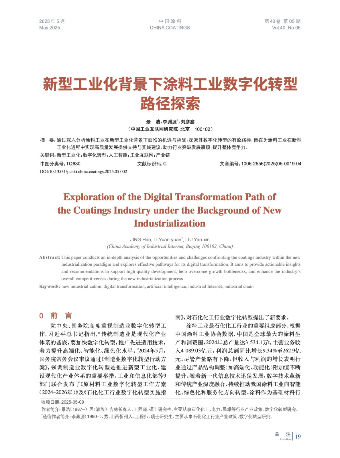 通過深入分析涂料工業在新型工業化背景下面臨的機遇與挑戰,探索其數字化轉型的有效路徑,旨在為涂料工業在新型工業化進程中實現高質量發展提供支持與實踐建議,助力行業突破發展瓶頸,提升整體競爭力。