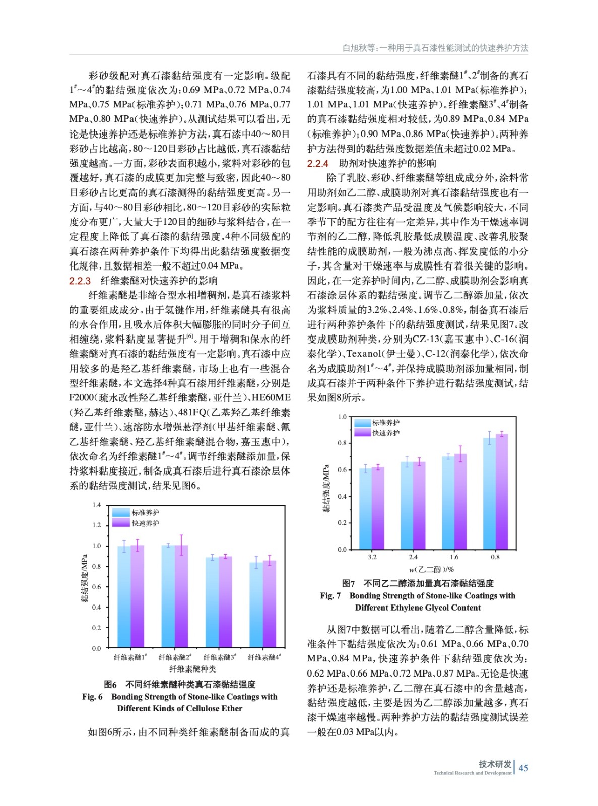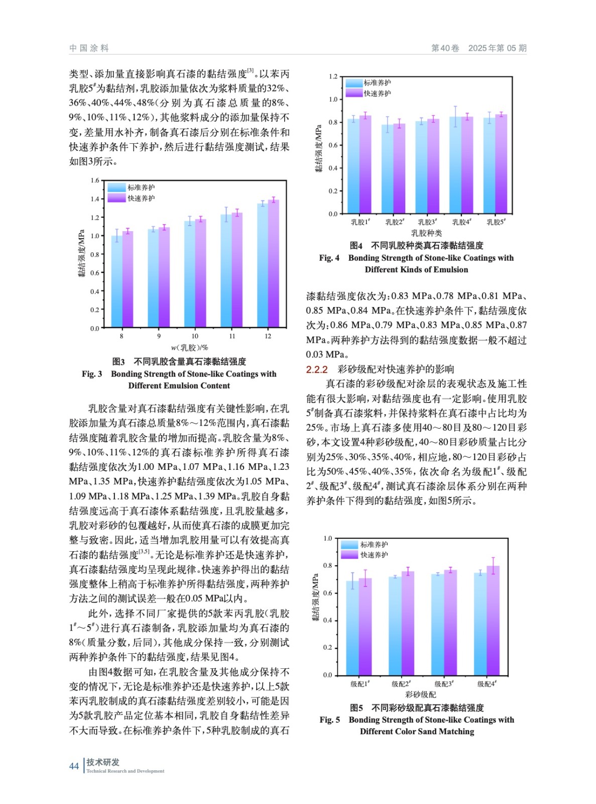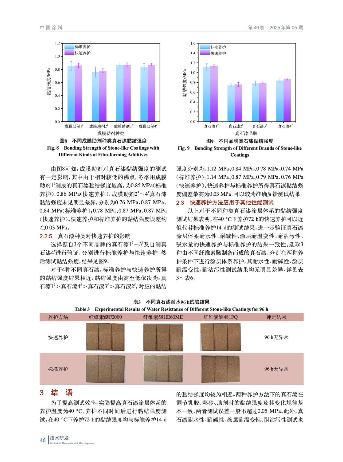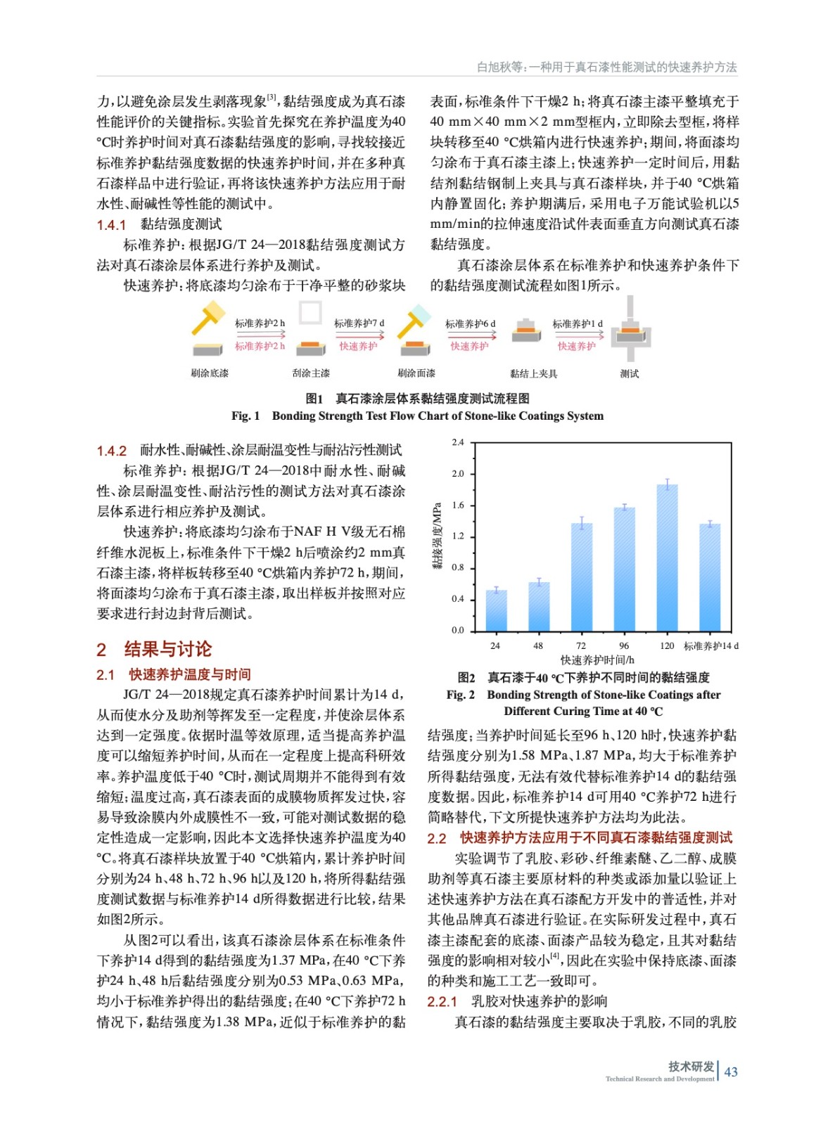 摘要:黏結強度是評價真石漆涂層體系性能的關鍵指標之一,長達14 d的養護周期對真石漆黏結強度等性能測試造成較大程度的延遲,因此考察通過適當提高養護溫度,對真石漆養護時間進行一定程度的縮短。實驗測試了養護溫度為40 ℃時不同養護時間的真石漆涂層體系黏結強度,確定了最佳快速養護時間。將該快速養護方法應用于多種真石漆樣品的黏結強度測試,驗證得出快速養護與標準養護條件下測得的黏結強度相差較小。采用該快速養護方法得到的樣板耐水性、耐堿性、涂層耐溫變性、耐沾污性測試結果均與標準養護樣板測試結果相近。該快速養護方法的應用有效縮短了真石漆涂層體系的測試周期,提高了真石漆產品的測試效率。