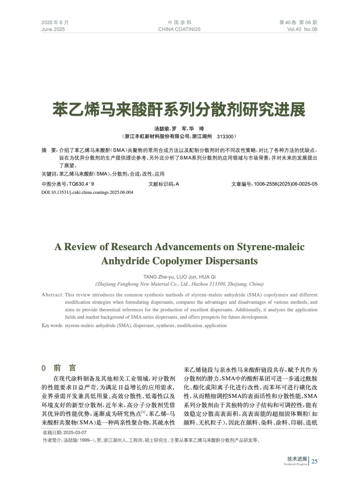 介紹了苯乙烯馬來酸酐(SMA)共聚物的常用合成方法以及配制分散劑時的不同改性策略,對比了各種方法的優缺點,旨在為優異分散劑的生產提供理論參考。另外還分析了SMA系列分散劑的應用領域與市場背景,并對未來的發展提出了展望。