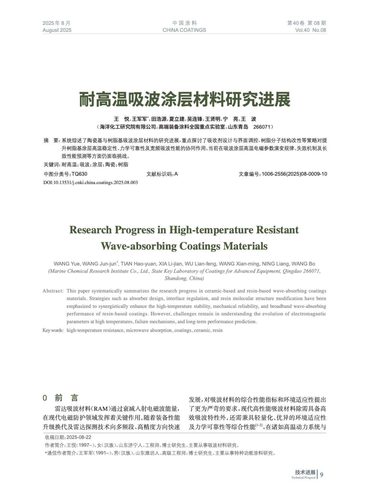 本文系作者@王 悅,王軍軍,田浩源,夏立建,吳連鋒,王賢明,寧 亮,王 波 授權中國涂料網發表,并經中國涂料網編輯,未經允許不得轉載,如需轉載請聯系chinacoatingnet@vip.163.com