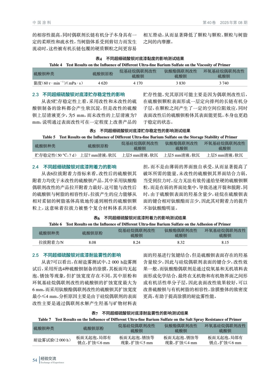 摘要:對比了不同改性劑改性超細硫酸鋇與未做處理的超細硫酸鋇原粉在溶劑型酚醛環氧底漆中的應用性能。對其分散性、貯存穩定性、耐沖擊、彎曲、附著力等常規性能,以及耐鹽霧性能、耐酸堿性等防腐蝕性能進行了對比研究。結果顯示,采用各類硅烷和鈦酸酯偶聯劑對硫酸鋇進行表面改性后,對其分散性、耐沖擊強度、彎曲強度、耐酸堿性等性能沒有明顯提升,但是鈦酸酯偶聯劑改性的硫酸鋇后降低涂膜的黏度,改善產品的貯存穩定性、拉拔附著力以及耐鹽霧性能。
