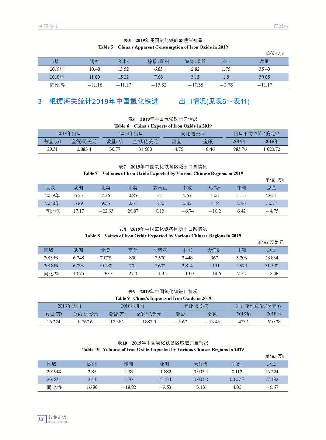 摘要:綜述了2019年中國(guó)氧化鐵行業(yè)經(jīng)濟(jì)指標(biāo)完成情況,并對(duì)行業(yè)進(jìn)出口數(shù)據(jù)進(jìn)行了分析,展望了氧化鐵行業(yè)2020年發(fā)展,陳述了其中可能存在的問(wèn)題、不足,并指出了行業(yè)綠色發(fā)展工作方向。