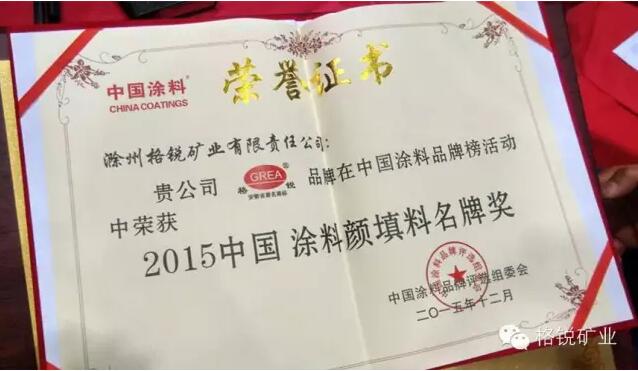 格銳礦業(yè)承蒙行業(yè)及廣大合作伙伴的厚愛,榮獲“2015年中國涂料顏填料名牌獎”殊榮。
