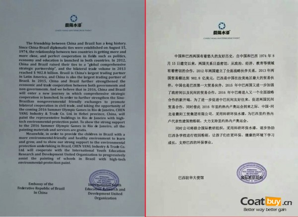 17年來,晨陽水漆始終致力于水漆的生產(chǎn)、研發(fā)和推廣,建有水性涂料院士工作站,攜手中科院打造水性涂裝納米材料實驗室,參與國家863計劃“風(fēng)電葉片防護涂料”項目,2008年成奧運粉刷工程材料供應(yīng)商,2015年大閱兵期間成天安門城樓粉刷指定用漆,并將聯(lián)合國際教研組織涂刷里約熱內(nèi)盧代表性建筑。