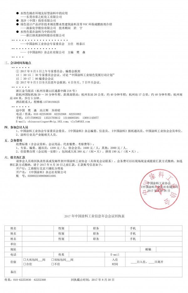 請參會人員將回執(zhí)表傳真或發(fā)郵件到中國涂料工業(yè)協(xié)會(具體見會議聯(lián)系),會務(wù)費可以以現(xiàn)場現(xiàn)金或提前匯款方式繳納。如選擇匯款方式繳納,請于2017年8月30日之前匯款,匯款賬號信息如下:
