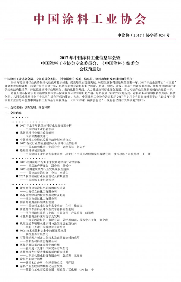 隨著人們環(huán)保意識的逐漸增強和國家環(huán)保法規(guī)及環(huán)保督察日趨嚴格,綠色發(fā)展已經(jīng)成為大勢所趨,涂料企業(yè)必須加快轉(zhuǎn)型升級、科技創(chuàng)新、共同完成涂料行業(yè)“十三五”綠色環(huán)保的使命。為此,中國涂料工業(yè)協(xié)會決定擬于2017年9月5-7日在杭州市舉辦“2017年中國涂料工業(yè)信息年會暨中國涂料工業(yè)協(xié)會專家委員會、《中國涂料》編委會會議”,屆時召開中國涂料工業(yè)協(xié)會水性工業(yè)涂料涂裝分會籌備會?,F(xiàn)將會議的有關(guān)事項通知如下: