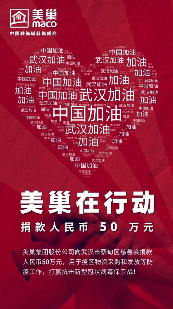 2月2日消息,美巢集團(tuán)股份公司向武漢市蔡甸區(qū)慈善會(huì)捐款人民幣50萬(wàn)元,用于疫區(qū)物資采購(gòu)和發(fā)放等防疫工作,打贏抗擊新型冠狀病毒保衛(wèi)戰(zhàn)!