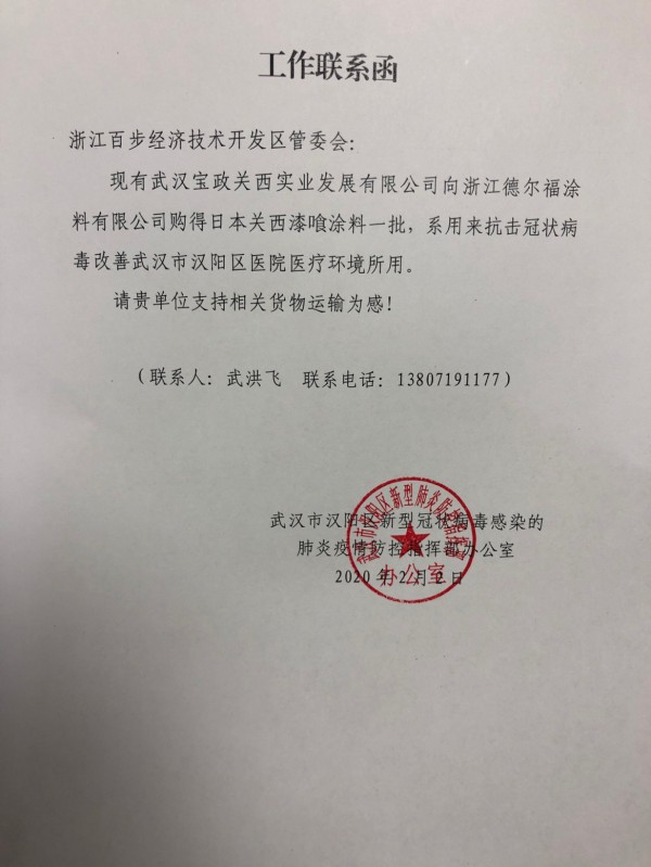 2月2日浙江德?tīng)柛M苛鲜盏狡浜眳⒐晒疚錆h寶政關(guān)西實(shí)業(yè)發(fā)展有限公司的緊急請(qǐng)求,急需采購(gòu)進(jìn)口日本關(guān)西品牌抗冠狀病毒涂料一批,用于改善漢陽(yáng)區(qū)醫(yī)療環(huán)境。
