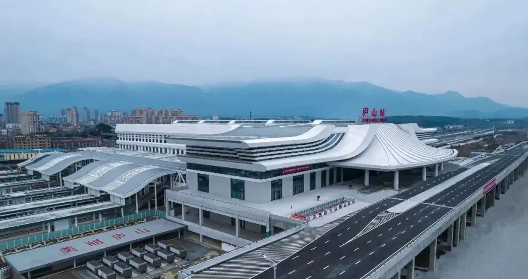 2022年4月底,九江市首座高鐵站——廬山站西站房正式開通運營。站臺設計融入廬山云霧和山水的柔美形態,色彩明快,意境唯美,與遠處的自然景觀遙相呼應,于山影水語間大放異彩!