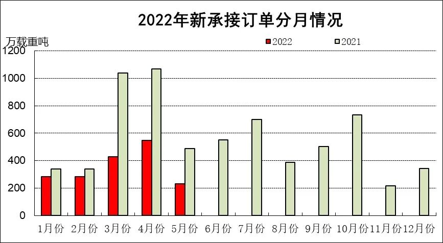 1~5月,50家重點監測造船企業造船完工1375萬載重噸,同比下降17.6%。承接新船訂單1650萬載重噸,同比下降48.4%。5月底,手持船舶訂單9899萬載重噸,同比增長19.4%。