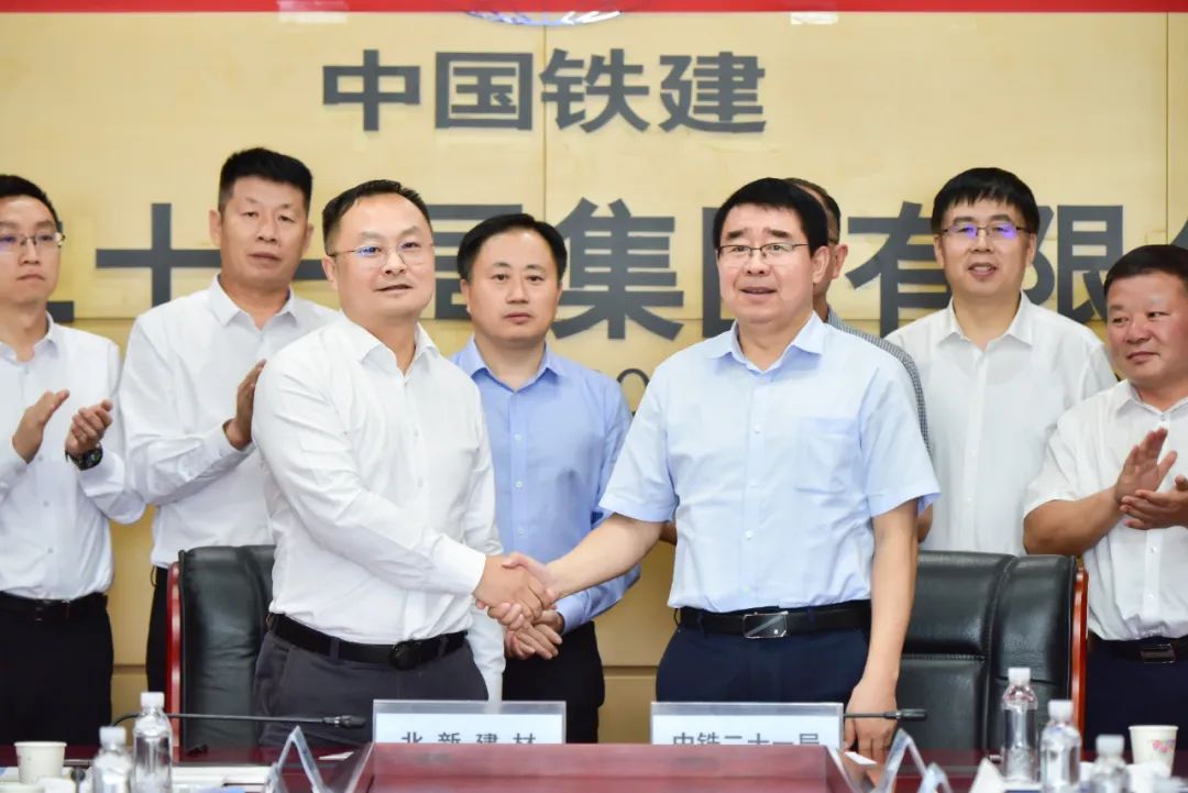 中鐵二十一局集團、西部鐵建工程材料科技有限公司和北新建材有關部門、單位負責同志參加簽約儀式和座談。中鐵二十一局集團有限公司隸屬國務院國資委下屬的中國鐵建股份有限公司,是集工程建設、科技研發、房地產開發、礦產資源開發及商貿經營等于一體的國有特大型建筑企業集團。擁有施工機械、檢測等設備4137余臺(套),年度施工能力400億元以上。先后完成了青藏鐵路等60多項國家鐵路干線工程建設、13000多條公里電氣化鐵路工程建設,都汶高速等40多條高等級公路建設。曾先后榮獲中國建筑工程魯班獎、詹天佑獎、廣廈獎、國家優質工程金(銀)獎、全國百項精品工程獎30多項;榮獲省(部)級優質工程獎60多項;榮獲國家、省部級科技進步獎30多項,其中國家科技進步特等獎1項;國家和省部級工法40多項、專利130多項,其中發明專利30多項,創中國建筑施工企業新紀錄6項。