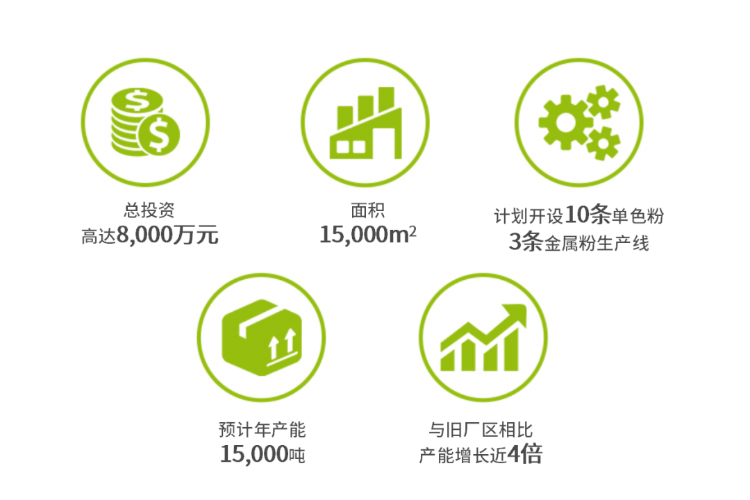 老虎新材料自主建設的眉山新工廠總投資高達8,000萬元,面積15,000㎡,計劃開設10條單色粉、3條金屬粉生產線,預計年產能15,000噸,與舊廠區相比產能增長近4倍。自此,老虎新材料坐擁四川眉山,聯合江蘇太倉、廣東清遠生產基地,形成中國三大地域支柱輻射全國。