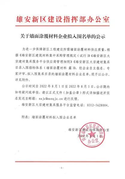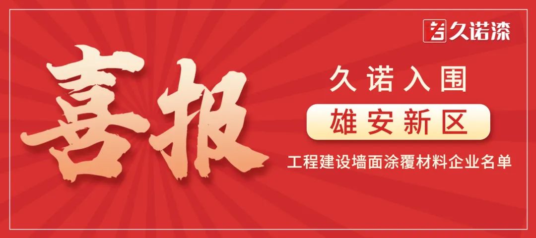 七月流火,白駒過隙,八月伊始,再傳喜訊:8月1日,雄安新區建設指揮部辦公室發布了關于墻面涂覆材料企業擬入圍名單的公示,久諾集團憑借高質量產品、系統的涂裝解決方案以及專業配套服務的強大優勢赫然上榜!