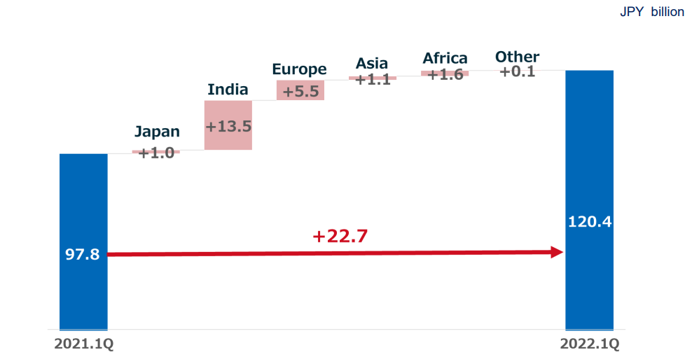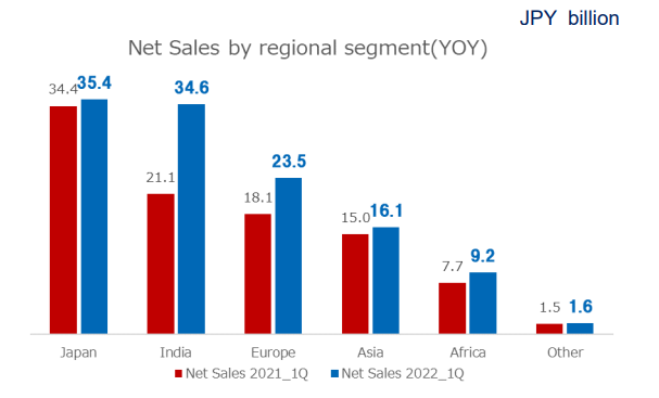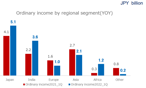 經(jīng)營利潤方面,日本經(jīng)營利潤達(dá)到51億日元,同比增長24%,主要受外匯匯率影響較多;印度經(jīng)營利潤36億日元,同比增長64%,主要原因同上,來自銷售量的增加;其他亞洲地區(qū)利潤下滑至21億日元,下滑主要因為成本上漲高于銷售價格導(dǎo)致;歐洲受俄烏戰(zhàn)爭和通貨膨脹的影響,經(jīng)營利潤同樣下降至10億日元,同比減少38%;非洲的經(jīng)營利潤突破10億日元,主要原因來自關(guān)西涂料在當(dāng)?shù)厥袌鲇芰Φ奶嵘?/p>