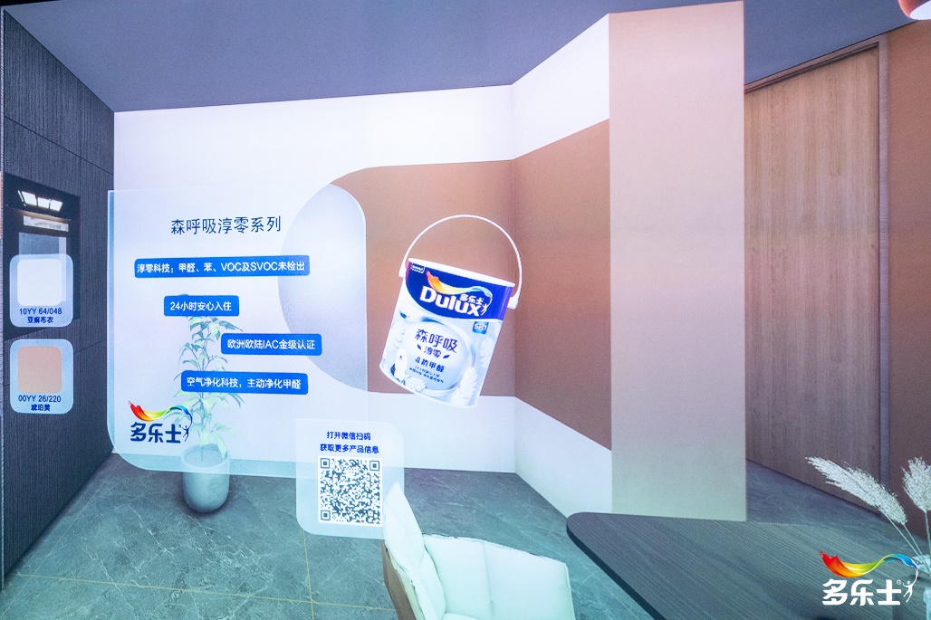 佩服多樂士把涂料展示做出了游戲感,讓人參與其中。在玩中體驗,在體驗中感受。人沉浸在其中,看到心儀的墻面效果,用手觸碰墻面,就會自動彈出對話框,告訴你這是多樂士森呼吸淳零系列的產品,并且展示這個產品的詳細介紹,擁有哪些認證、功能都羅列其中。總之就是“有吸引力,好看、有趣、酷炫”。
