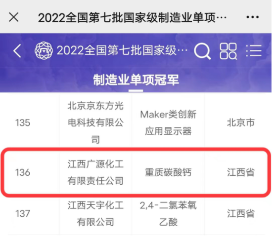 近日,工業(yè)和信息化部辦公廳、中國(guó)工業(yè)聯(lián)合會(huì)發(fā)布了“2022年第七批國(guó)家級(jí)制造業(yè)單項(xiàng)冠軍企業(yè)(產(chǎn)品)名單”,江西廣源化工有限責(zé)任公司成功入圍全國(guó)制造業(yè)“單項(xiàng)冠軍示范企業(yè)”公示名單。