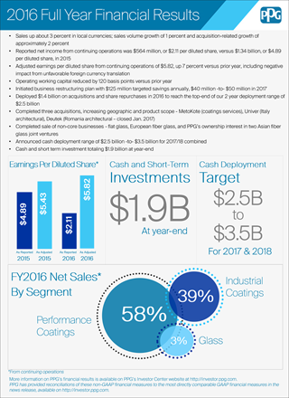 PPG公司董事長兼首席執(zhí)行官M(fèi)ichaelH.McGarry表示:“盡管全球經(jīng)濟(jì)增長緩慢,各地區(qū)表現(xiàn)參差不齊,再加上非常不利的匯率影響,我們第四季度和全年調(diào)整后每股攤薄收益仍然實(shí)現(xiàn)了穩(wěn)步增長。通過提高銷量,積極的成本管控,加上多項(xiàng)致力于盈利增長的現(xiàn)金部署,公司在2016年仍然實(shí)現(xiàn)了業(yè)務(wù)發(fā)展的各項(xiàng)里程碑。”